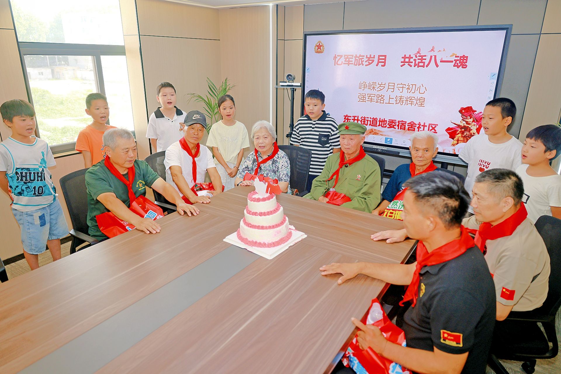 在中国人民解放军建军98周年到来之际,安徽省蚌埠市上下喜迎建军节,进一步加强军政军民团结,营造拥军优属、拥政爱民浓厚氛围,掀起“军民共建鱼水情深、军地发展再铸辉煌”的热潮。连日来,记者走进社区、街头及训练场等,用镜头记录下社会各界以自己的方式向最可爱的人致敬。7月30日,东升街道地委宿舍社区开展以“忆军旅岁月 共话八一魂”为主题的“八一”建军节系列活动。