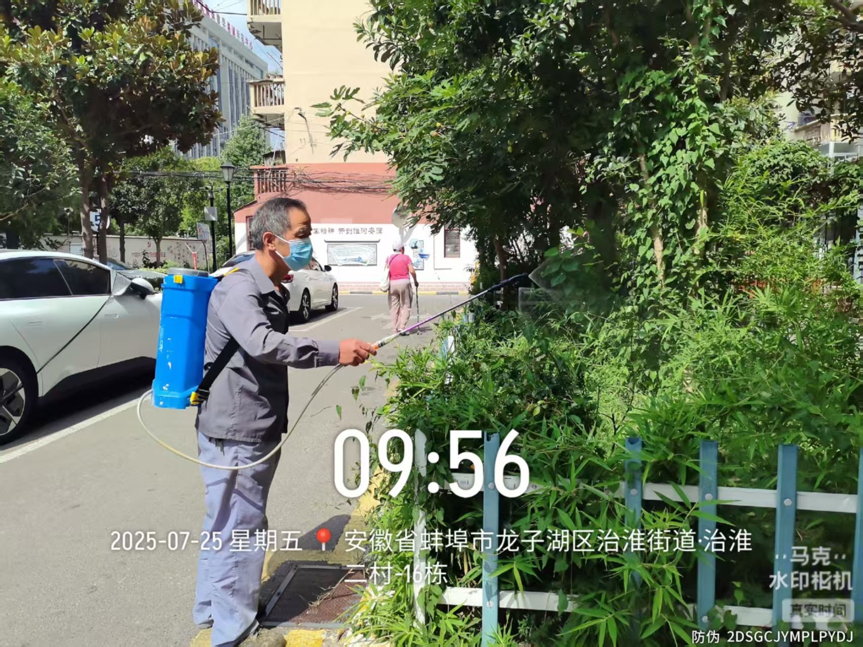 在环境治理上,街道发动社区各网格与小区物业公司协同发力,采取“物理+化学”相结合的防制手段:组织人员翻盆倒罐清除积水、清理杂草消除蚊虫孳生地,同时规范安装诱蚊灯,并定期开展药物喷杀,形成全方位灭蚊防线。