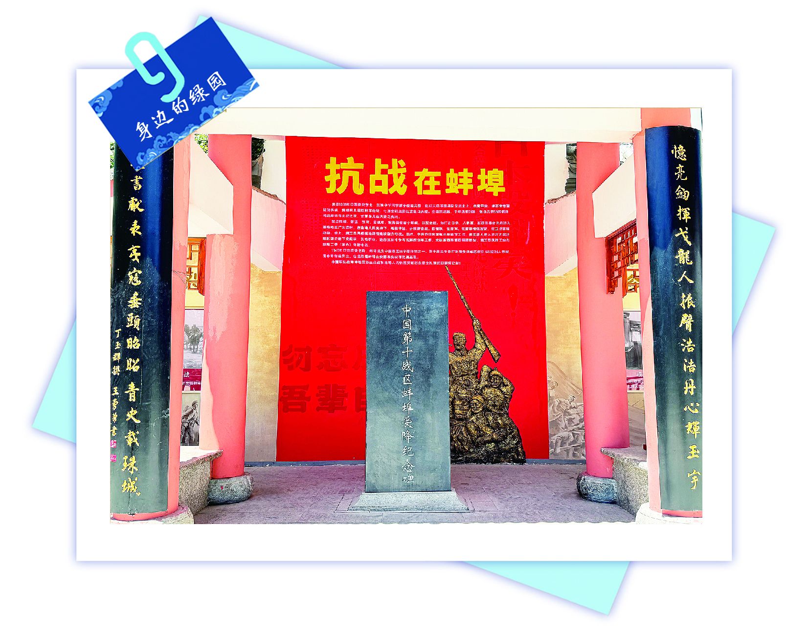 去年8月,这座占地约1800平方米、投资约59.8万元的红色主题口袋公园,在原有纪念亭和公共花坛基础上进行整合改造。“因原有纪念碑文字模糊,重新制作的纪念碑正面镌刻‘中国第十战区蚌埠受降纪念碑’,背面详述受降概况。”国富街社区书记周芹介绍,墙面展板全面美化修整,亭柱悬挂起“忆亮剑挥戈龙人振臂浩浩丹心辉玉宇,看投书献表夷寇垂头昭昭青史载珠城”的楹联,“勿忘历史,吾辈自强”八个大字醒目有力。