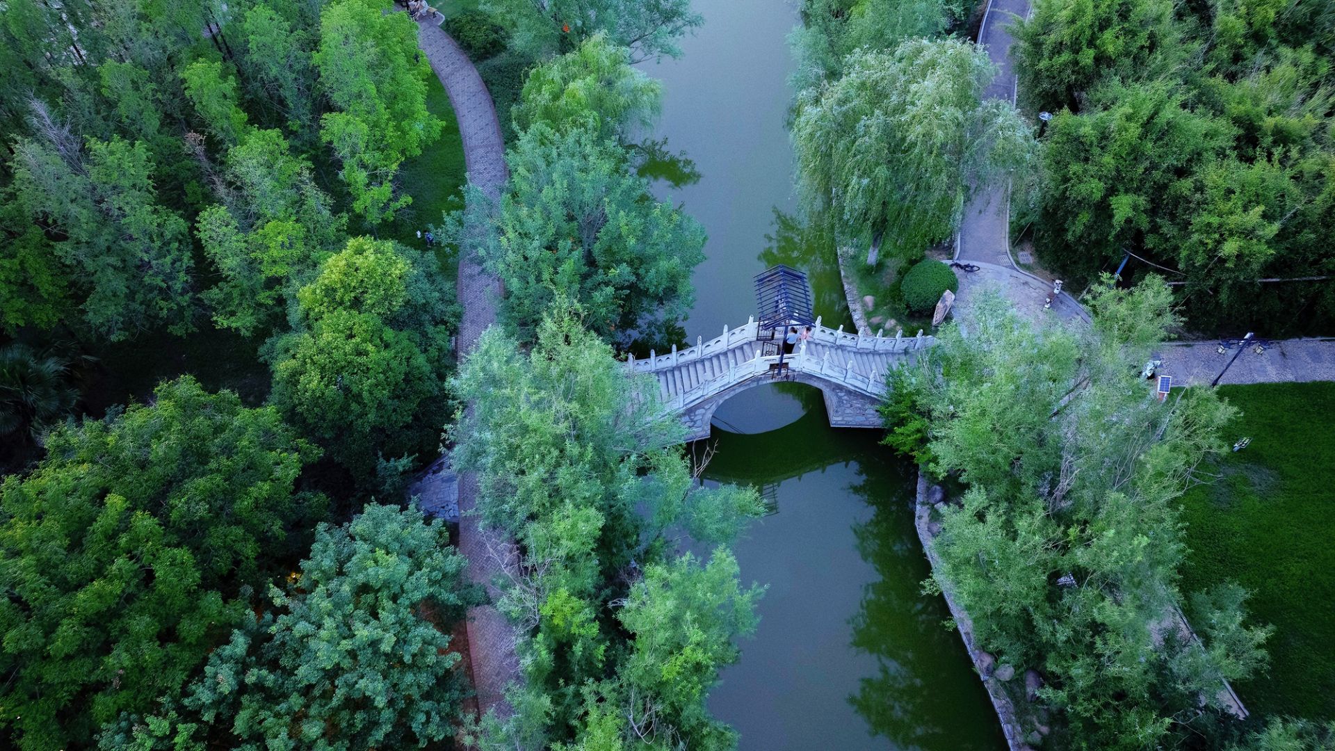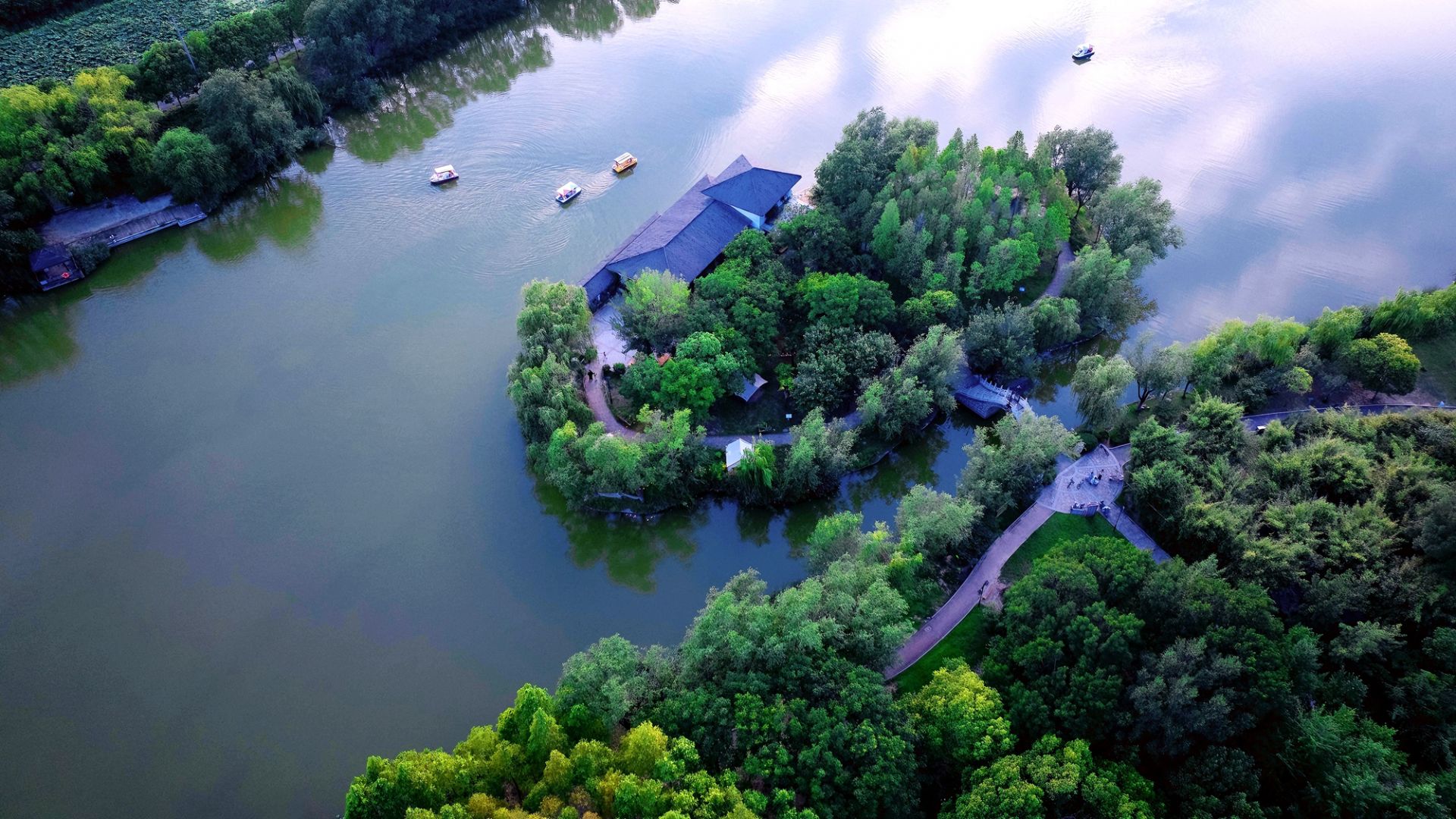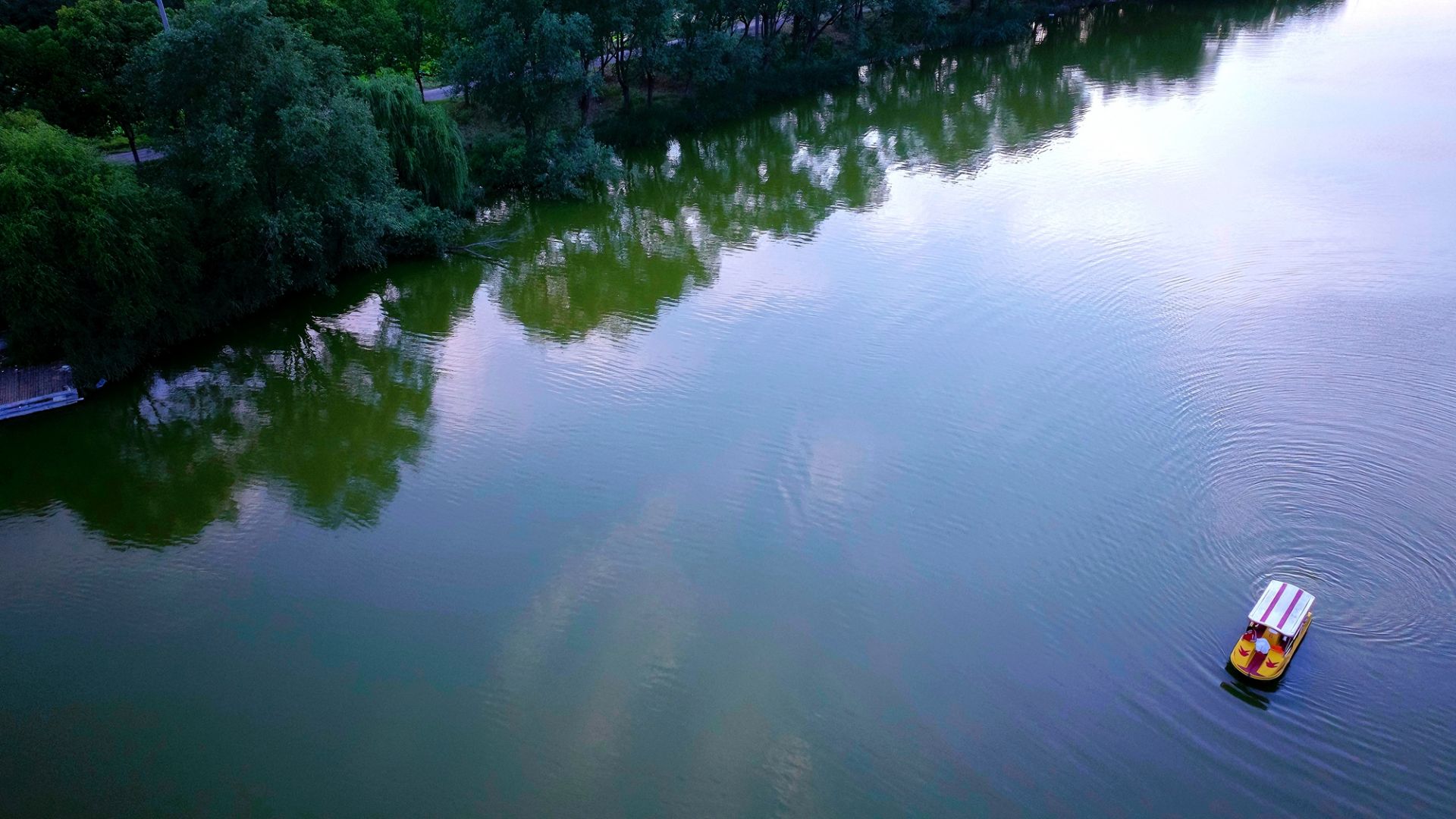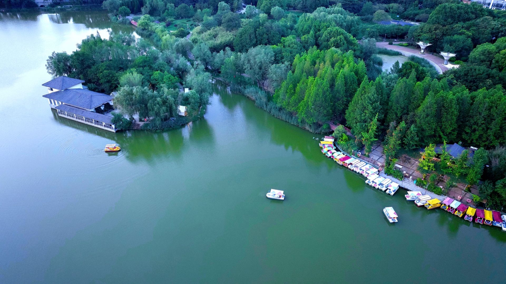 俯瞰安徽省蚌埠市固镇县城西公园,湖心小岛静卧碧波。青绿肆意蔓延,树影与湖水缠绵,游船划开涟漪,把暑气揉碎在风里,满是沁人的清凉。