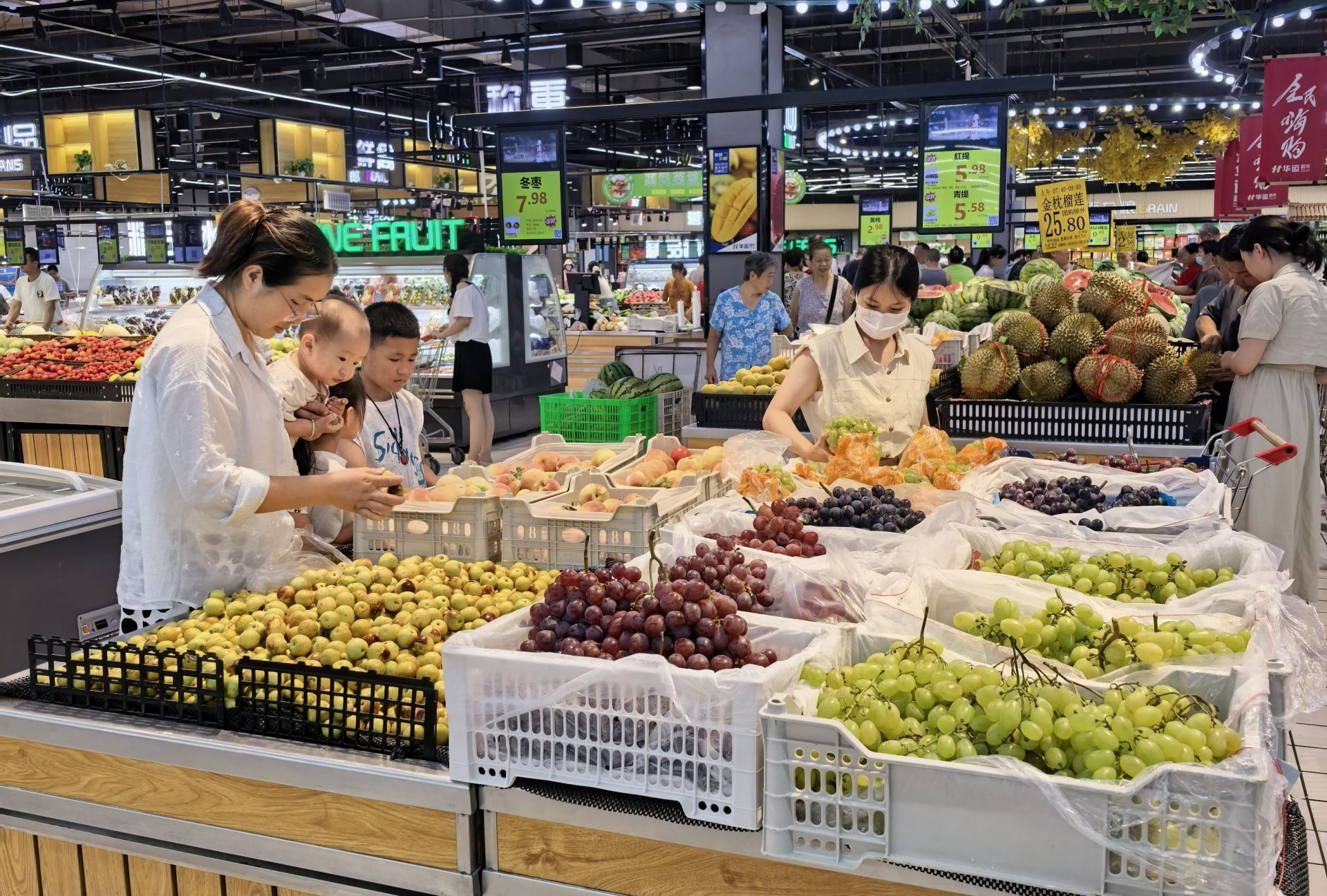 在华运超市中心店的生鲜区,桃子家族十分壮大,水蜜桃饱满多汁,油桃表皮光滑鲜亮,黄桃则散发着独特的果香。巨峰、夏黑、阳光玫瑰等品种葡萄一应俱全,一串串沉甸甸的葡萄摆满货架,让人垂涎欲滴。
