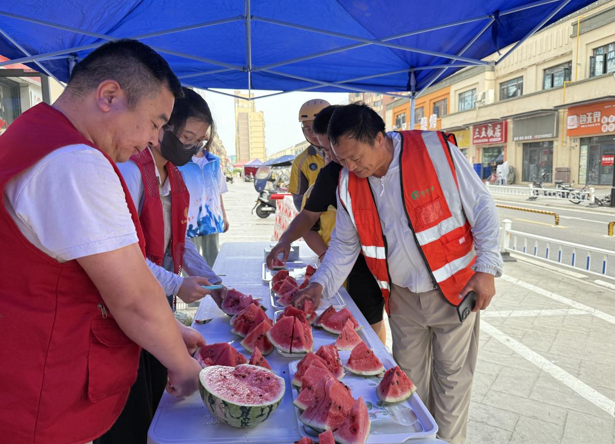 活动现场,社区工作人员早早就忙碌起来:搭起遮阳棚、摆放防暑物资……一份份装有藿香正气水、清凉油、毛巾等实用物品的清凉礼包整齐排列,与矿泉水共同筑起一座“爱心小山”。“来,师傅!这是您的清凉礼包,注意防暑。”工作人员一边递礼包,一边关切的叮嘱。刚切开的西瓜瓤红汁多,香脆清甜,外卖小哥笑着说:“这西瓜比空调还解暑!”环卫工人张阿姨捧着礼包说:“社区总惦记着我们,干活都更有劲了!”现场欢声笑语不断,劳动者们脸上洋溢的幸福笑容。