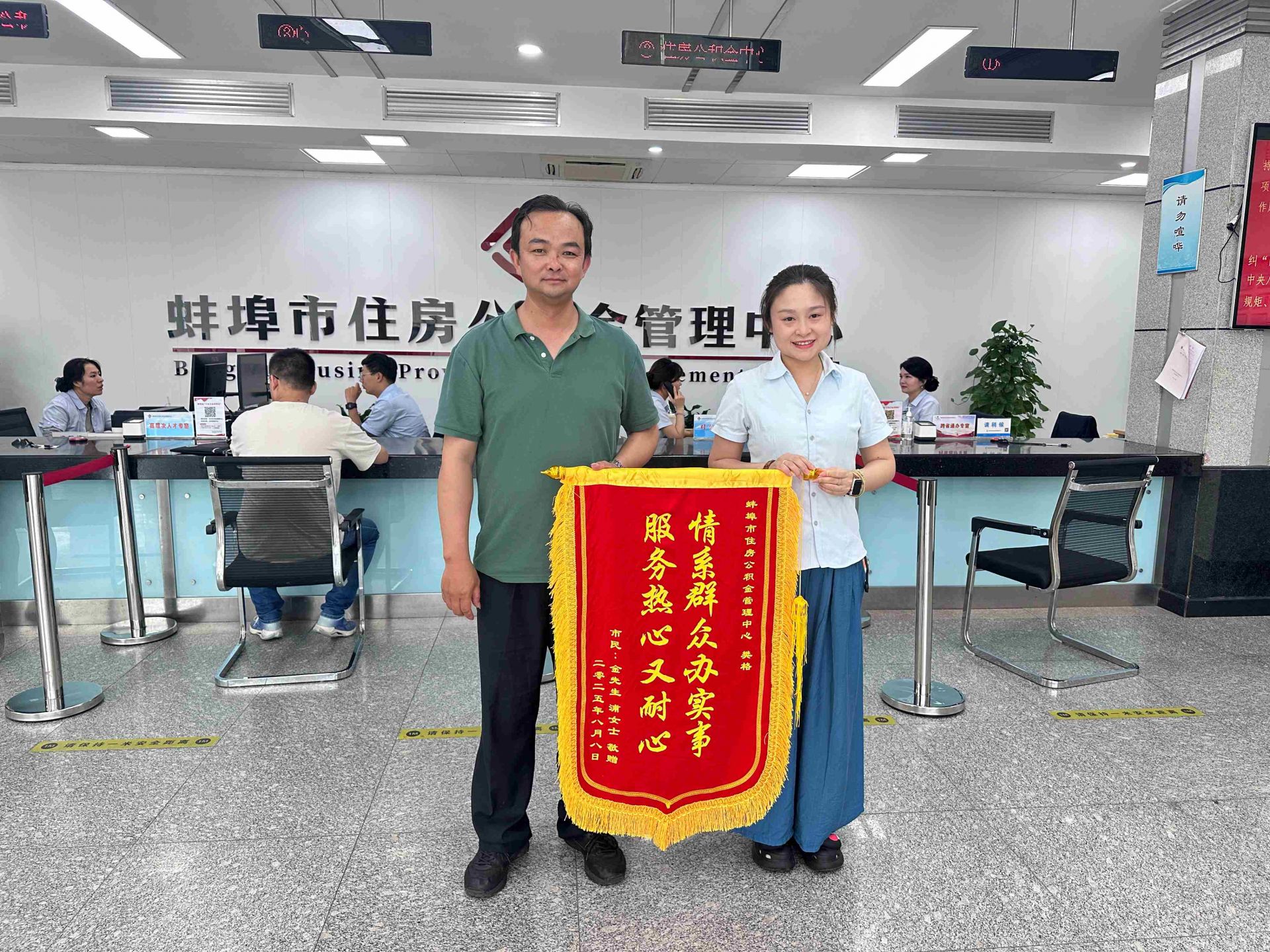 “差一点就没赶上新政,幸亏工作人员给我们开通了绿色通道,还款的利息减少了不少。”8月8日上午,蚌埠市住房公积金管理中心服务大厅上演暖心一幕——市民金先生夫妇将一面写着“情系群众办实事 服务耐心又热心”的锦旗,亲手交到工作人员樊格手中。