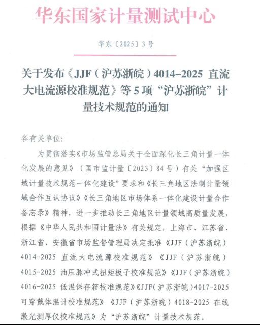 在线激光测厚仪是薄膜生产、玻璃制造、锂电池极片加工等现代工业关键环节不可或缺的精密测量设备。长三角作为我国制造业高地,汽车、电子、新能源等战略性产业对材料厚度测量的精准性和一致性要求日益严苛。统一、科学的校准规范是保障产业链质量稳定、促进区域产业协同发展的基础支撑和技术基石。 JJF(沪苏浙皖)4018-2025《在线激光测厚仪校准规范》科学界定了测量范围、示值误差、重复性等核心计量特性,创新性地解决了传统校准方法与实际生产线动态环境脱节的技术难题。 该规范的发布与实施,将有力推动长三角区域内在线厚度测量设备的量值统一与互认,显著降低跨区域贸易中的技术壁垒与质量风险,赋能区域内企业提升产品质量和生产效率。