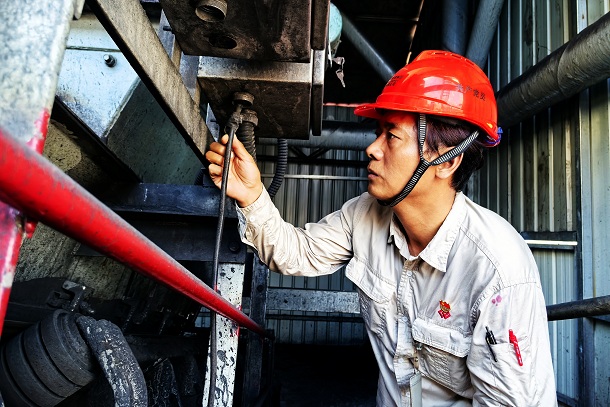 图为员工对码头3号固定吊就地控制箱电源线进行检查