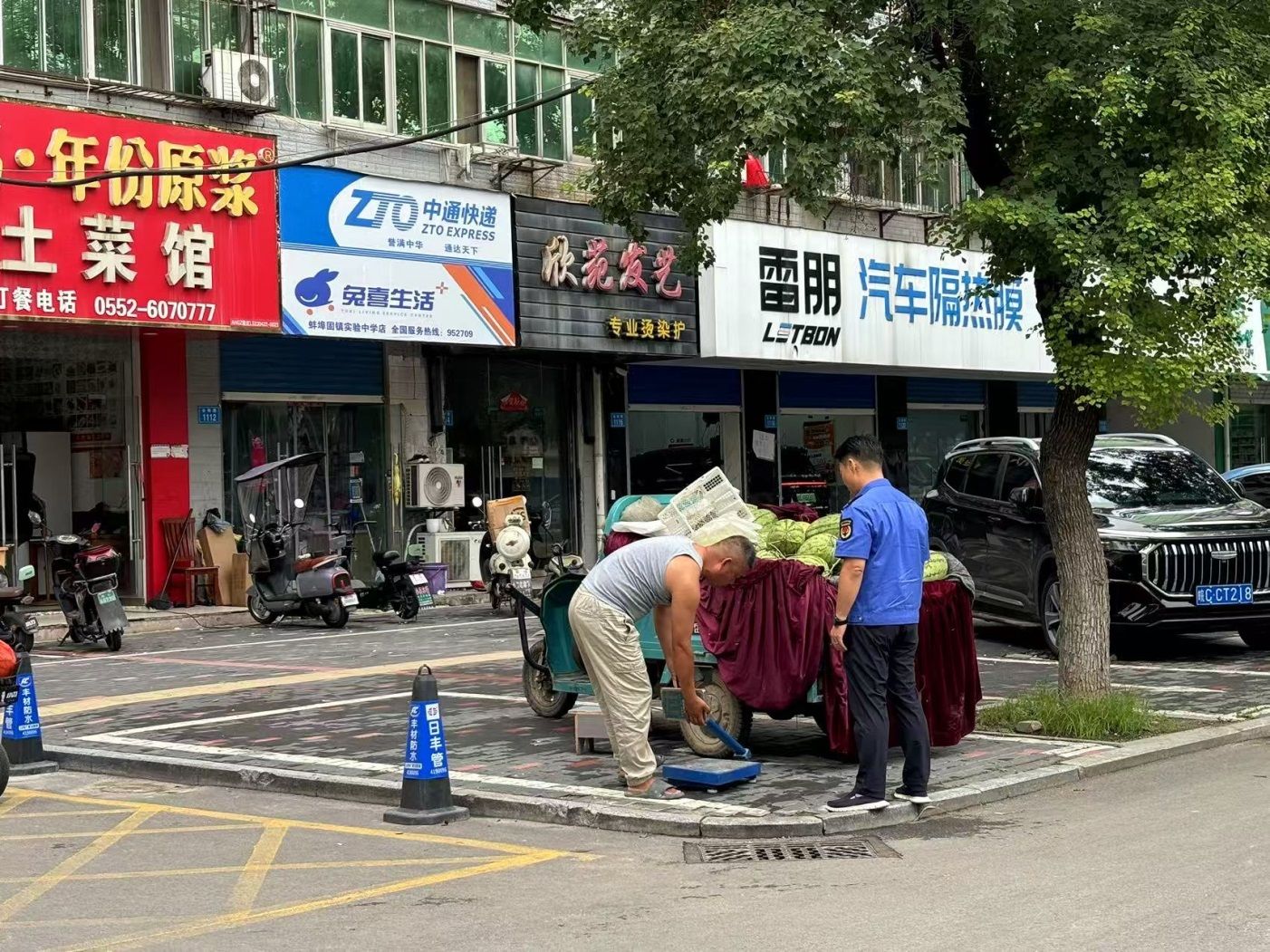 固镇县津浍市场和老东菜市场是县城最具烟火气的地方,然而早高峰的人流车流与占道经营的交织,常常让菜市场周边道路沦为“堵点”。执法人员将疏堵结合作为工作准则,一边引导商户规范摆摊,一边疏导来往车辆行人。执法人员的声音在嘈杂的市场中穿梭,让繁忙的市场既保持活力又不失秩序,这份便捷背后,是执法人员用汗水保障的民生通道。