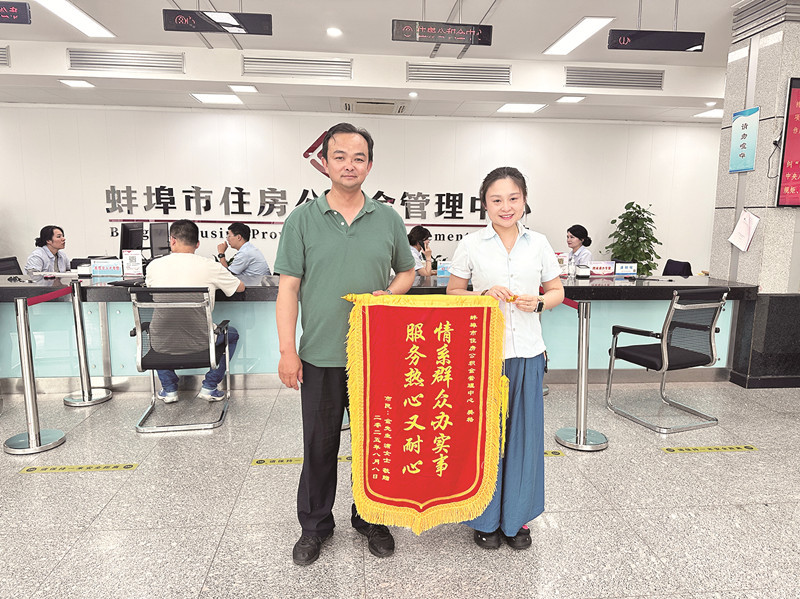 “差一点就没赶上新政,幸亏工作人员给我们开通了绿色通道,还款的利息减少了不少。”8月8日上午,蚌埠市住房公积金管理中心服务大厅上演暖心一幕——市民金先生夫妇将一面写着“情系群众办实事 服务耐心又热心”的锦旗,亲手交到工作人员樊格手中。