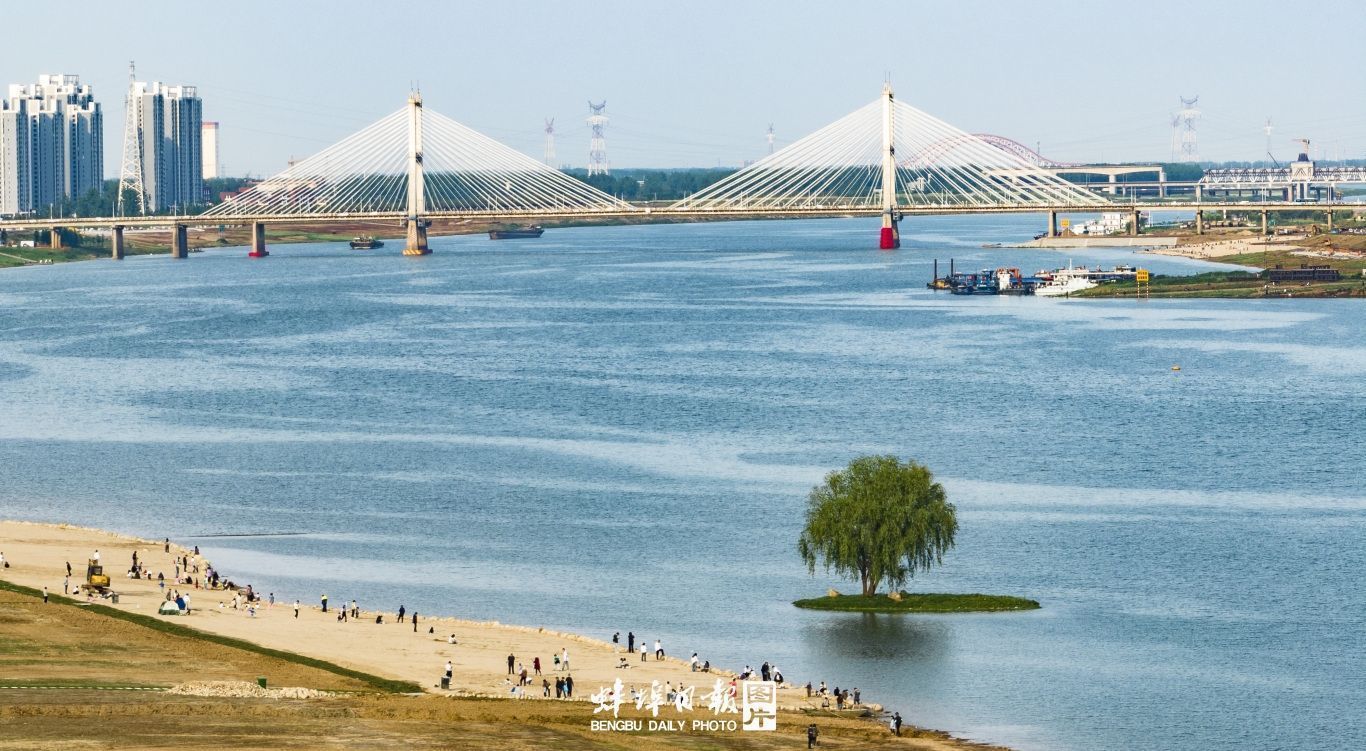 独树岛上,一棵垂柳临水而立,柔枝拂波,亭亭如少女浣发,游人慕名而来,既为欣赏它水中央的曼妙身姿,也愿在岸边倾听淮河治理与生态守护的浪漫故事;亲水广场上,孩子们玩沙嬉水,尽情释放快乐;健身步道向远处不断蜿蜒,网球场、篮球场等体育场地临水而建,人们在美景中书写光阴的故事;河面上延安路淮河大桥、司马庄路淮河大桥正以雷霆之势拔节“生长”……