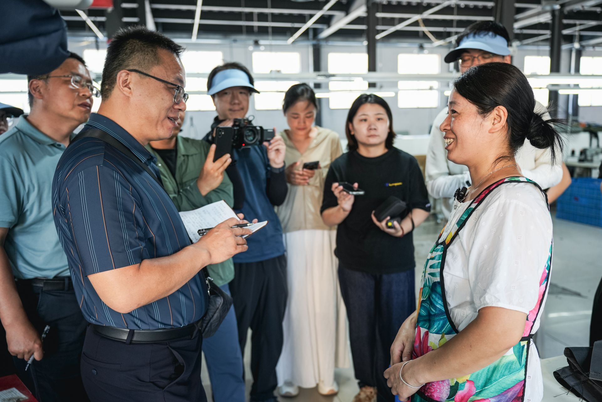 当天上午,采访团第一站来到红亮乡村振兴产业园内的红亮箱包厂,这家创办于2015年的企业吸纳了近两百名周边群众就业。企业车间里挂着醒目的横幅“看好孩子管好田,一天能挣百十元”。“在这里工作既能照顾家庭,又有稳定收入,很满足。”车间一组组长郑继影笑着说。