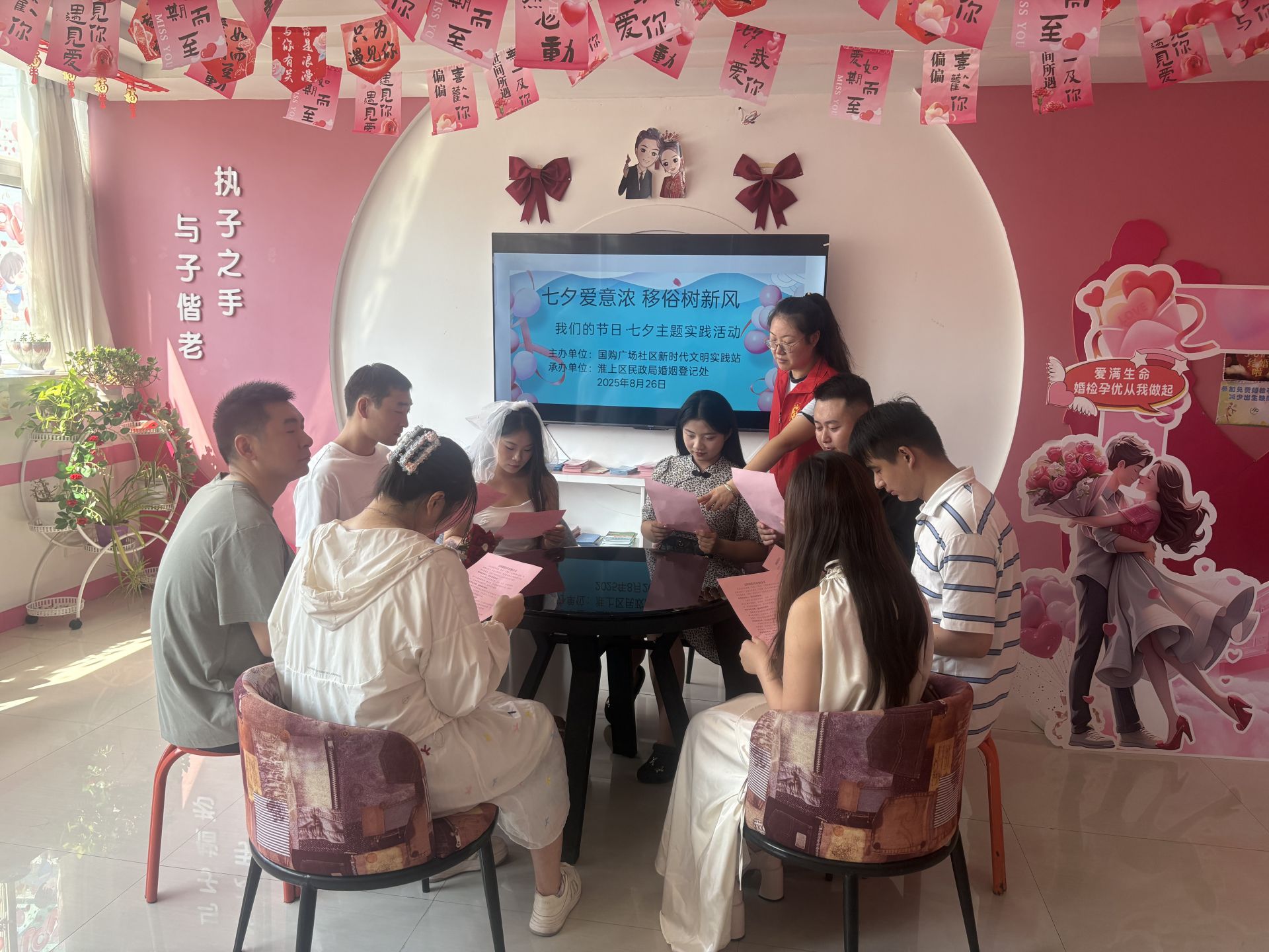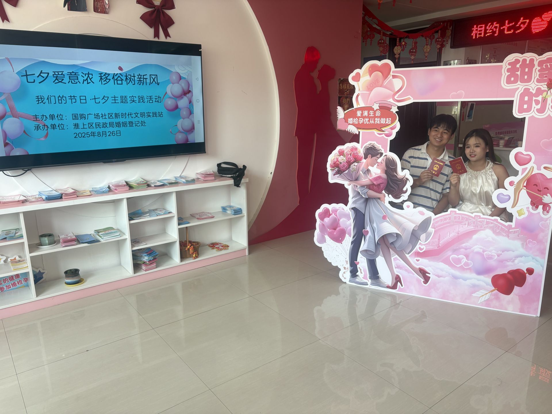 为推动婚俗改革,倡导形成婚事新办喜事简办的社会风尚,8月29日上午,国购广场社区联合淮上区婚姻登记处开展“七夕爱意浓 移俗树新风”我们的节日·七夕主题实践活动。