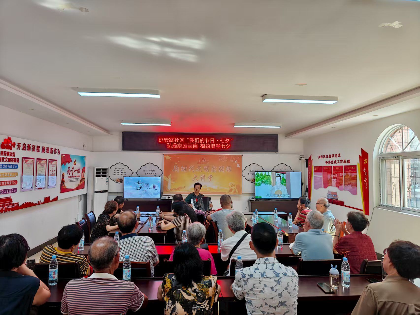 活动伊始,工作人员生动讲述了七夕节的起源与传说,从牛郎织女的经典故事到七夕节蕴含的爱情忠贞、传统习俗等文化内涵,让在场居民深入了解传统节日的魅力。在“家风分享”环节,社区特别邀请了辖区三对模范夫妻,分享他们相濡以沫、共建和睦家庭的动人故事。“家风就是一家人互相扶持,把简单的日子过好”,朴实的话语打动了在场每一位听众,不少家庭从中感受到婚姻经营与家风传承的真谛。紧接着,在苏怀忠手风琴美妙的演奏中,男士们手捧娇艳鲜花郑重献给妻子,一句简单的“辛苦了”“我爱你”,让现场不少夫妻露出幸福笑容。