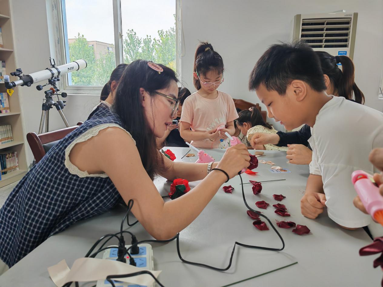 诵读环节后,七夕主题玫瑰花手工制作同步开启。参与者将彩带裁剪成相同的长度,做成花瓣的形状,然后再把做好的花瓣按相应的顺序粘贴在一起,最后再把准备好的枝杆连接好,这样一朵色彩鲜艳“玫瑰花”就做成了,一朵朵玫瑰花逐渐成型,既是献给亲爱的人的礼物,也是承载节日记忆的手作;亲子家庭合作默契,互相帮忙,指尖的动作里满是对节日的期待与对彼此的心意。
