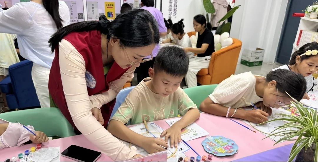 最热闹的要数互动体验环节啦!在“穿针引线”小游戏中,重现古人乞巧的场景,参与者专注地比拼手速,既紧张又有趣;小读者们则围坐在一起绘制绘画团扇,拿起画笔在素白扇面上勾勒星辰花鸟等图案,稚嫩的笔触里满是对七夕文化的美好想象;编绳手工区更是欢声笑语不断,在志愿者老师的耐心指导下,一根根彩绳在指尖穿梭,变成了一件件精美的手工作品。大家互相交流技巧,彼此帮助,不仅学习了传统手工艺品的制作,更收获了满满的友谊和快乐。