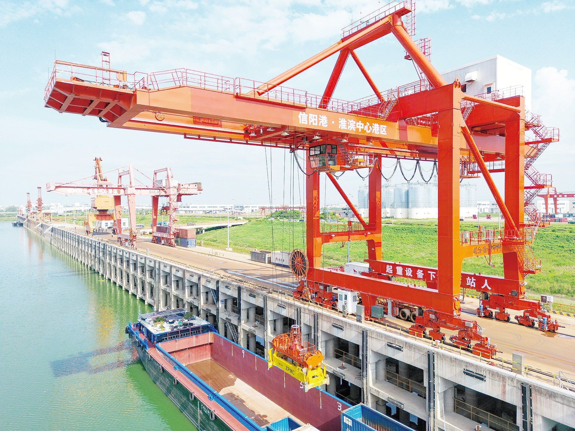 晨光洒向淮河主航道,信阳港·淮滨中心港的龙门吊正精准抓取集装箱,满载货物的轮船鸣笛启航,即将驶向东方。