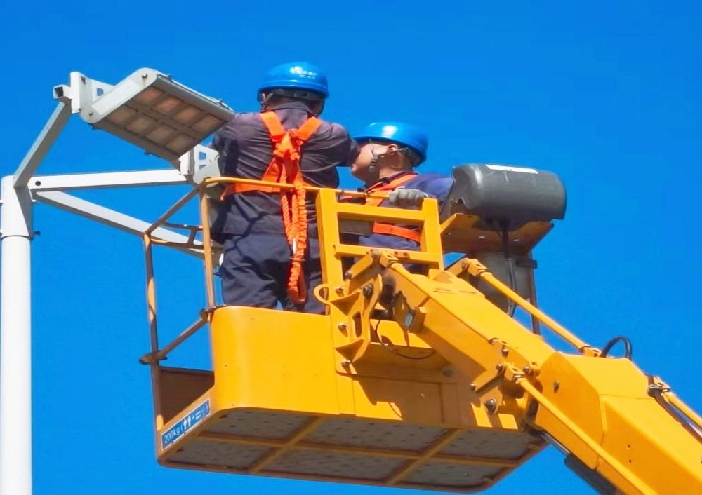 11:00,地表温度接近50℃。路灯维修工人高悬于炽热的灯杆旁,汗珠模糊视线,却仍精准排查故障、迅速修复调试,确保每盏路灯如期点亮夜色。