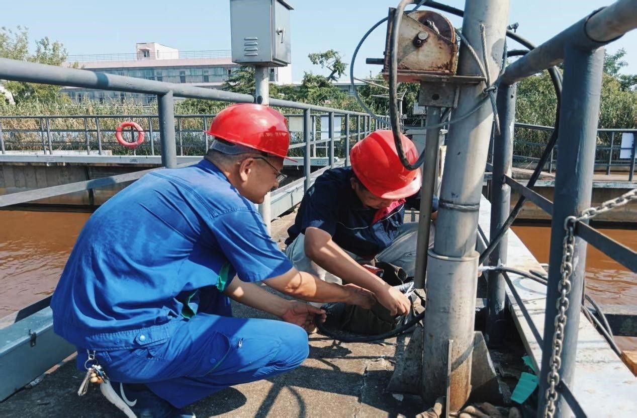 14:30,蚌埠市第一污水处理厂氧化沟旁,电工师傅正紧急抢修推流器——污水处理的关键设备。阳光直射、高温蒸灼,他们争分夺秒排除故障、更换零件,筑牢高温下的环保防线。