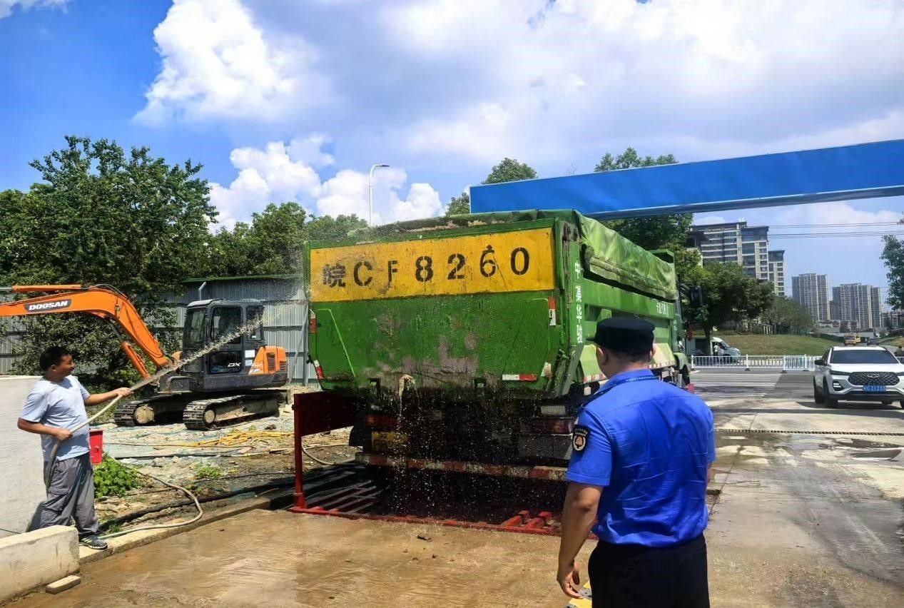 15:00,蚌埠市固体废弃物管理中心城管执法队员在高温中专注渣土作业检查,从严把控“密闭运输、净车出场”等环节。汗水浸透衣襟,执着守护市容。