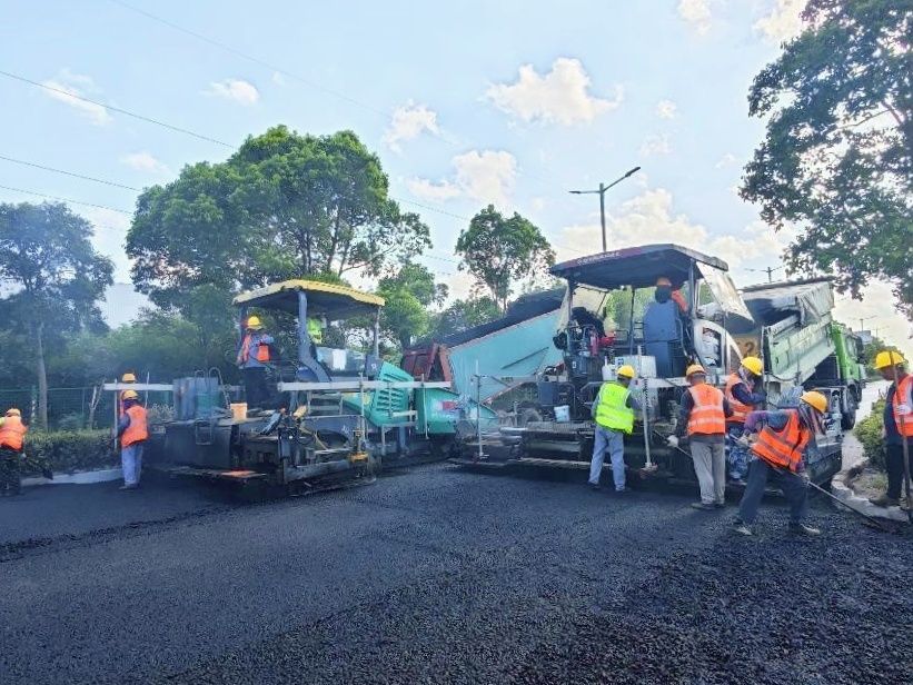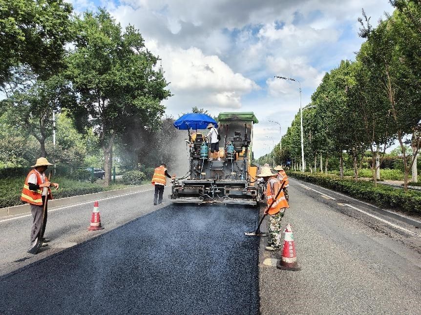 17:00,蚌埠市胜利西路开展沥青摊铺作业。施工人员坚守37℃高温现场,严格按标准流程推进工作。