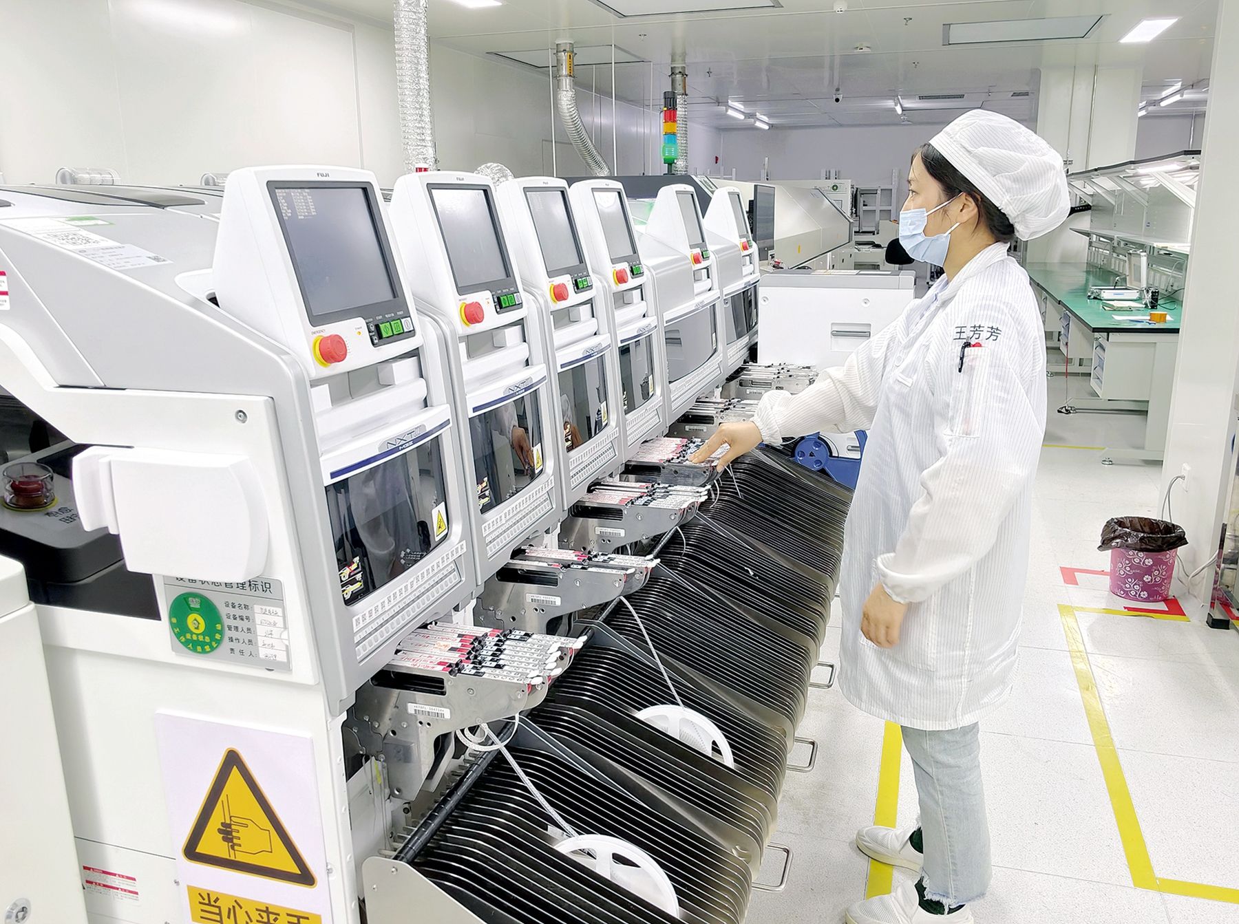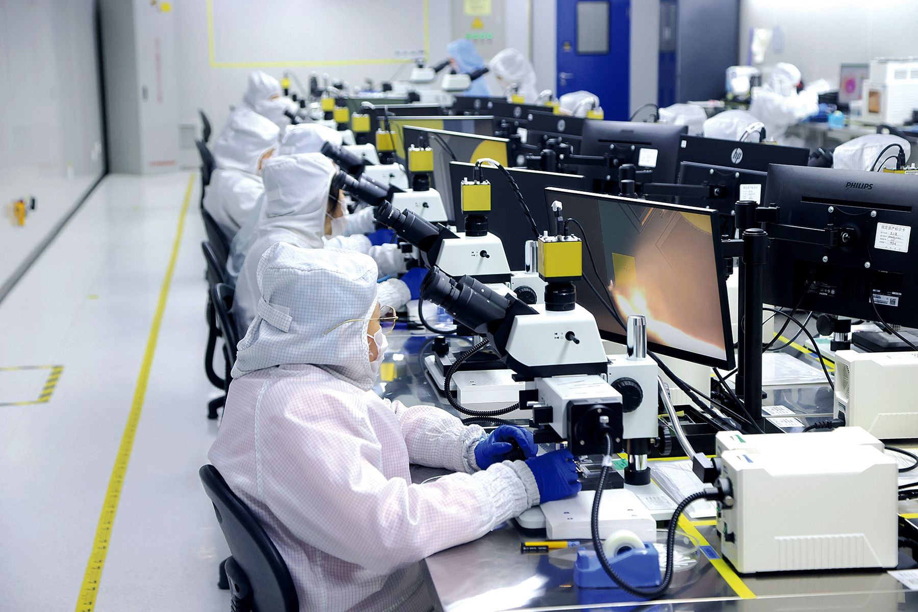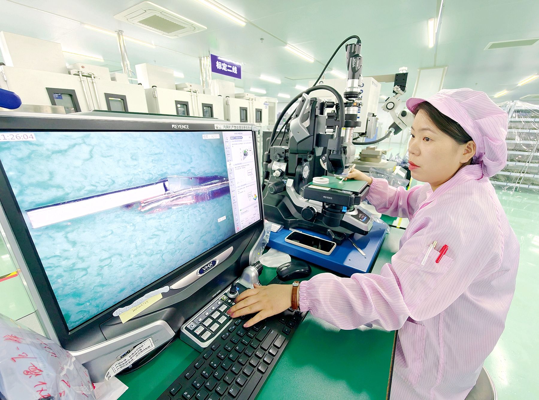 9月10日,安徽京芯传感科技有限公司生产车间,工作人员使用光学显微镜对产品进行检测。