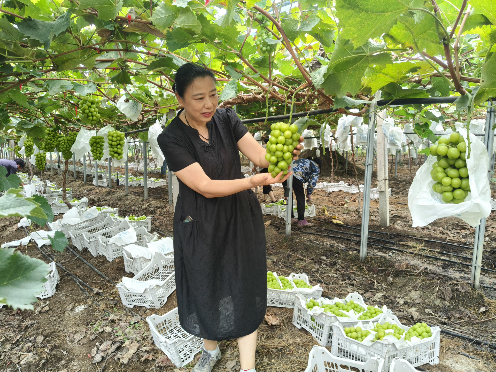 葡天下家庭农场负责人胡月琴介绍:咱这葡萄园可是咱翁庄的宝贝。前几年,在镇村的支持下,我开始尝试种植葡萄。一开始也遇到不少困难,但是村里请来了专家指导,慢慢地就走上了正轨。现在,我们的葡萄不仅在本地畅销,还通过电商卖到了全国各地。葡萄园每天有40名左右工人上班,也带动当地农民就业增收。