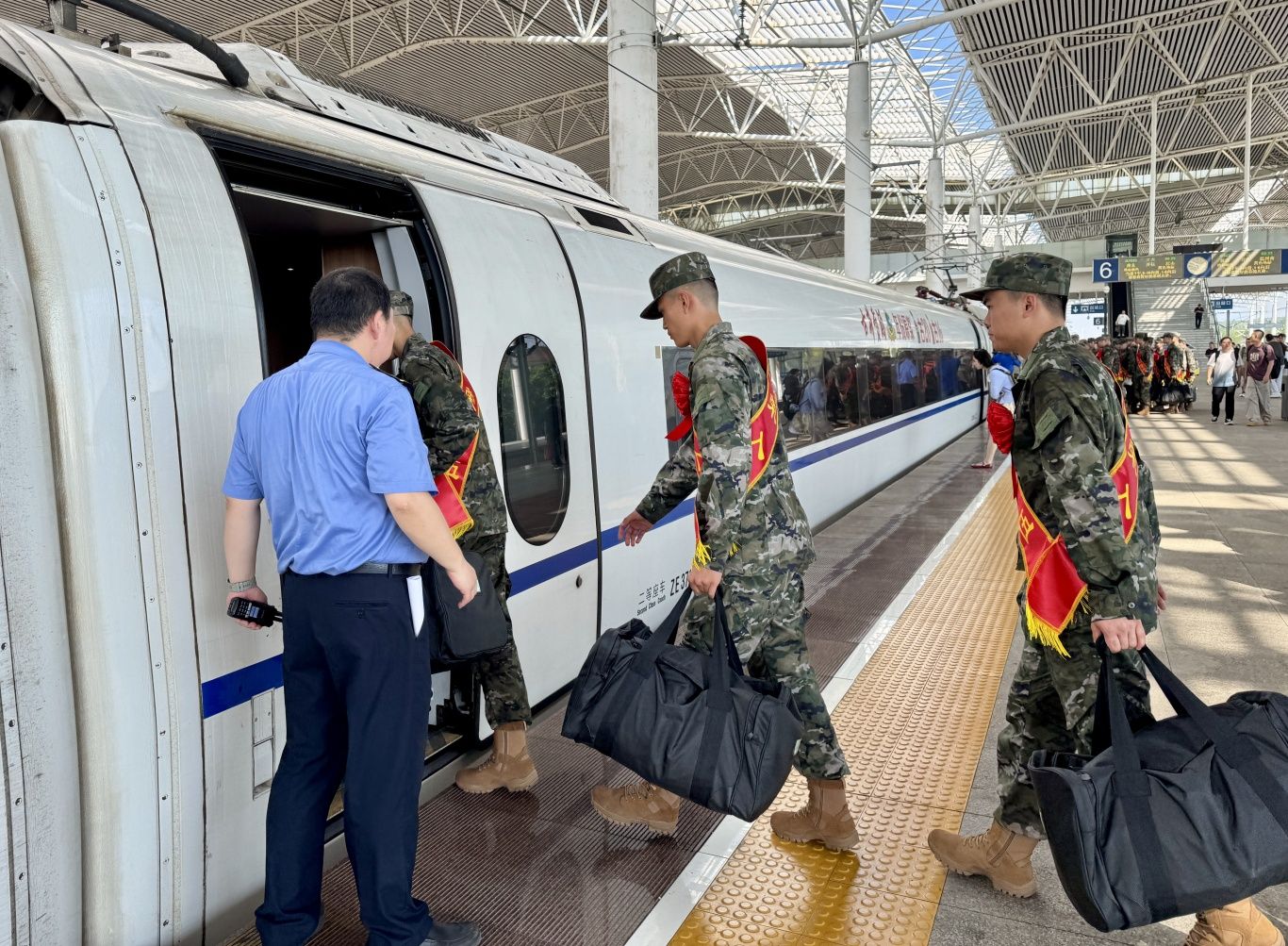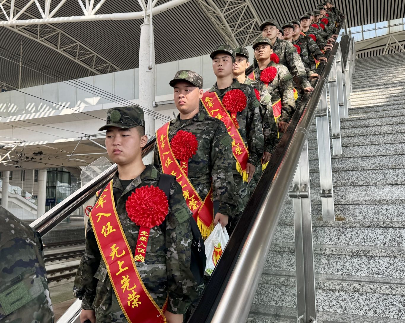 9月16日上午,蚌埠市欢送入伍新兵出征活动在高铁蚌埠南站广场举行。 送兵现场,气氛庄重而又热烈,蚌埠军分区领导现场欢送新兵。570余名身着崭新迷彩服的新兵们,肩扛使命担当,在亲友、战友与家乡人民的祝福中,带着对军营的憧憬、对祖国的忠诚,分批登上列车,奔赴全国各地军营,开启军旅生涯。(尤靖文)
