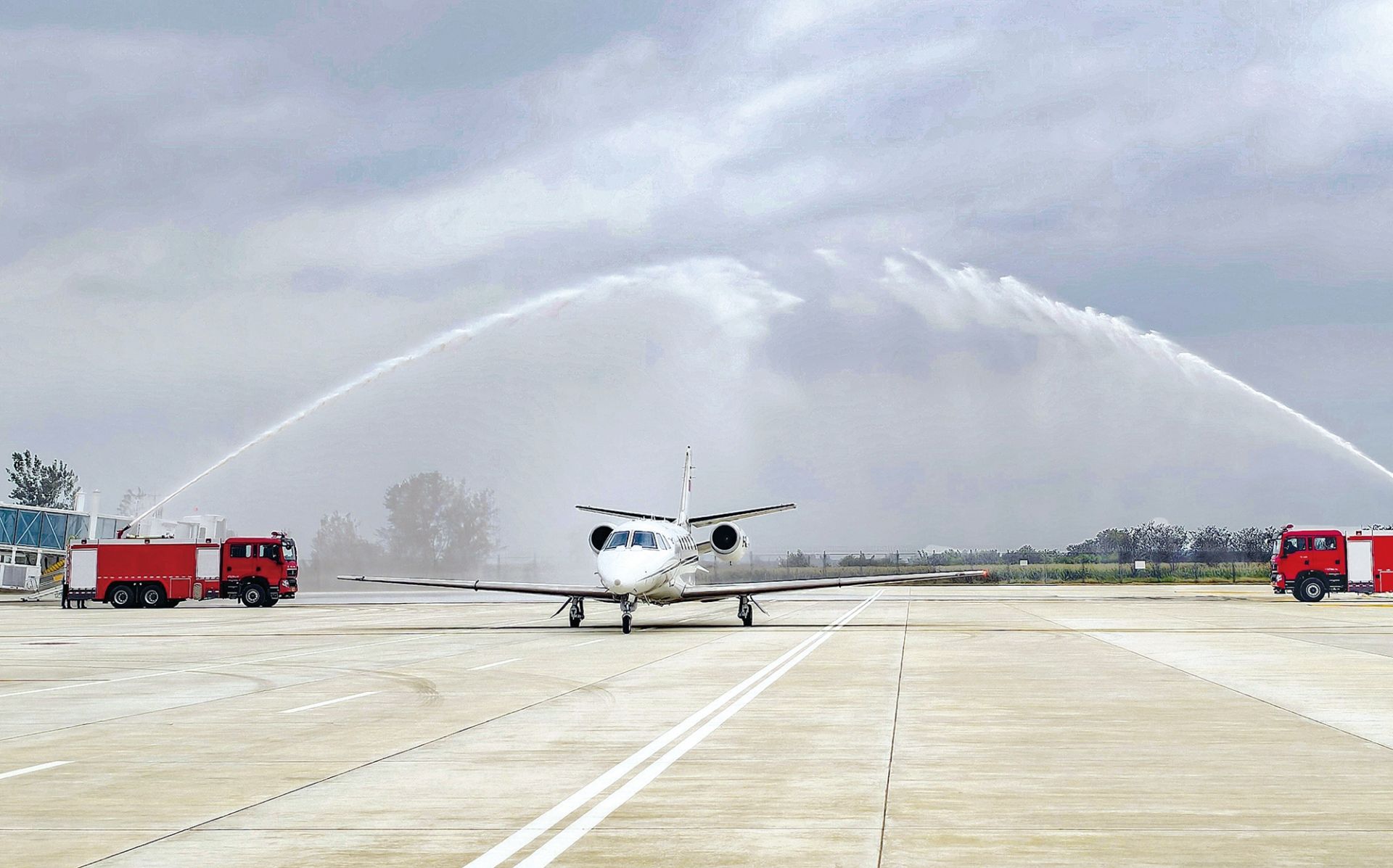 9月22日14时55分,塞斯纳C560校验飞机平稳降落蚌埠滕湖机场。