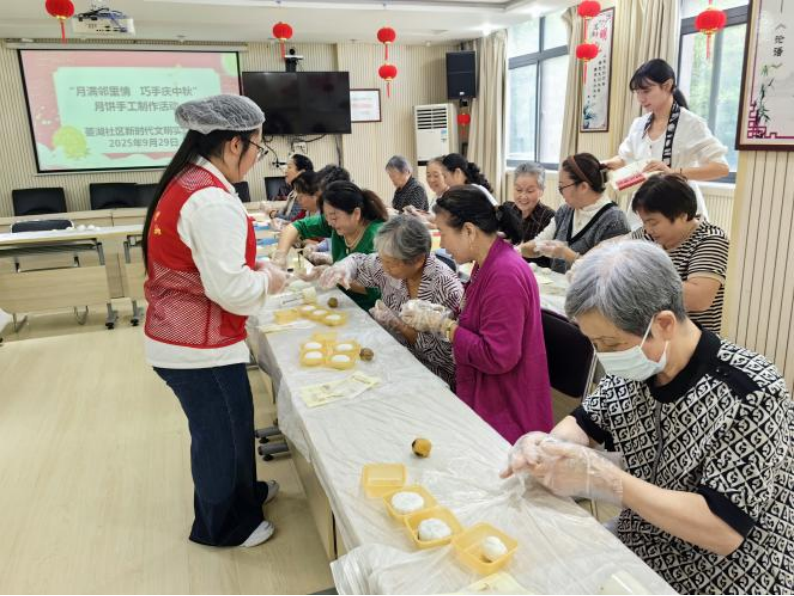 在中秋节到来之际,为弘扬中华传统文化,营造节日氛围,增进与社区居民的邻里情谊,菱湖社区新时代文明实践站开展“月满邻里情 巧手庆中秋”月饼手作活动。邀请辖区居民共同参与亲手制作月饼,以手作传递温情,提前感受中秋佳节的温暖与团圆。