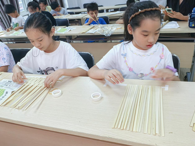 在“传统竹编”非遗手工活动中,孩子们领略到了指尖上的匠心。志愿者为孩子们讲解了竹编技艺的历史渊源、制作工具和基本技法,阐述了这项古老手工艺从实用器具到艺术精品的演变历程及其蕴含的劳动智慧。实践环节中,志愿者悉心指导孩子们认真学习挑、压、编、织等基本手法,亲身体验竹编制作的乐趣。经过努力,一把把精巧的小团扇在孩子们手中诞生,让他们收获了亲手创造的成就感,增强了对竹编非遗技艺的认同感。