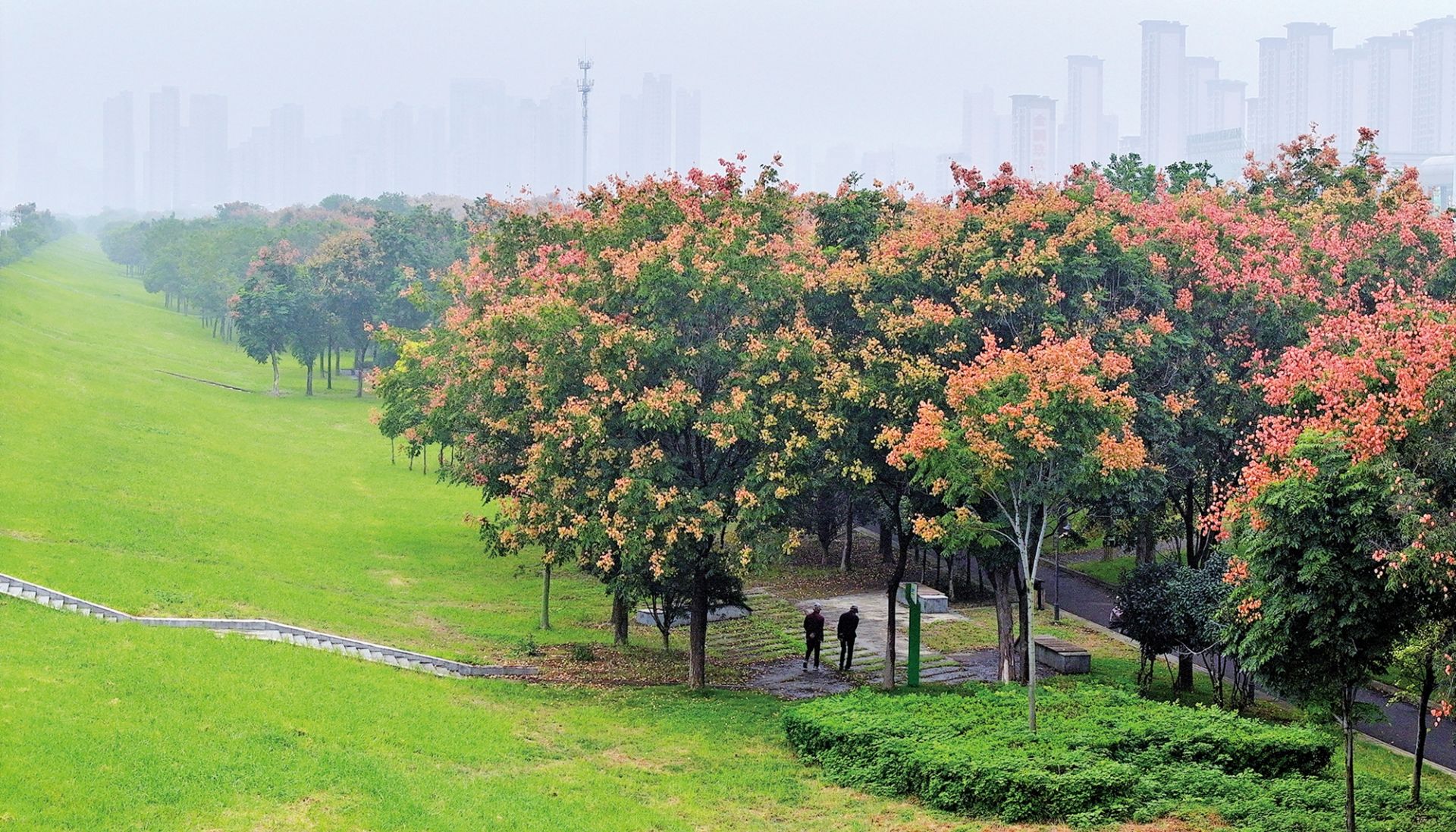龙子湖东公园层林尽染,秋色宜人,市民在树下拍照打卡。(刘晨 陈昂)