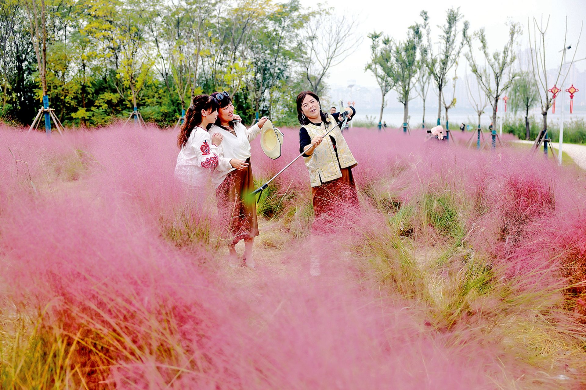 龙子湖东岸公园内粉黛乱子草盛开,吸引众多游人合影留念。