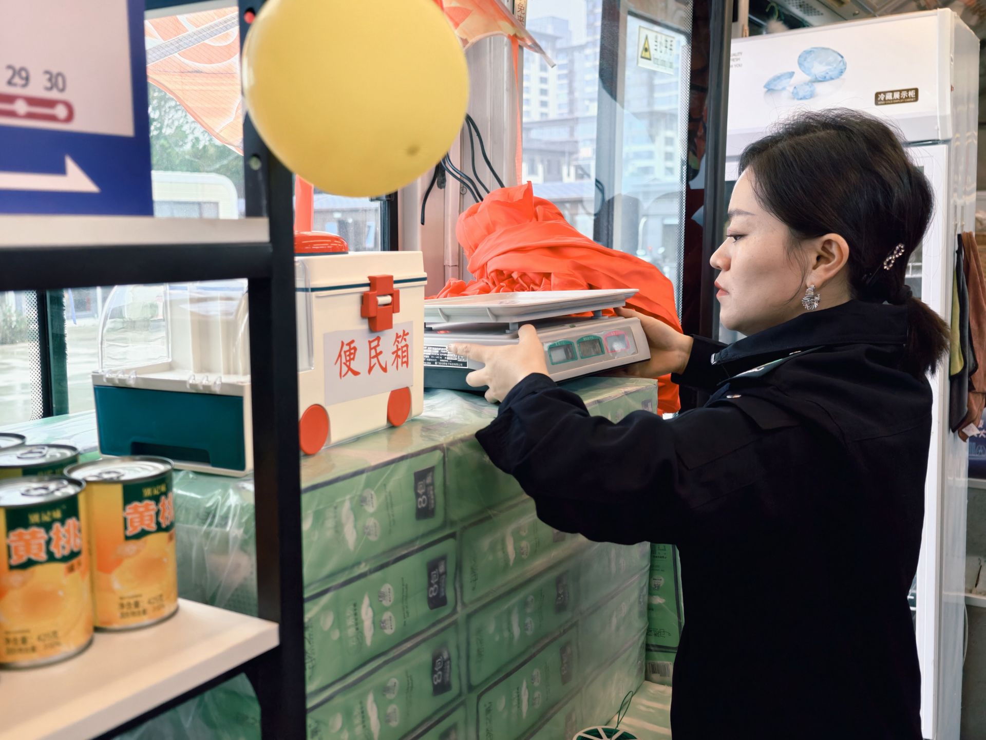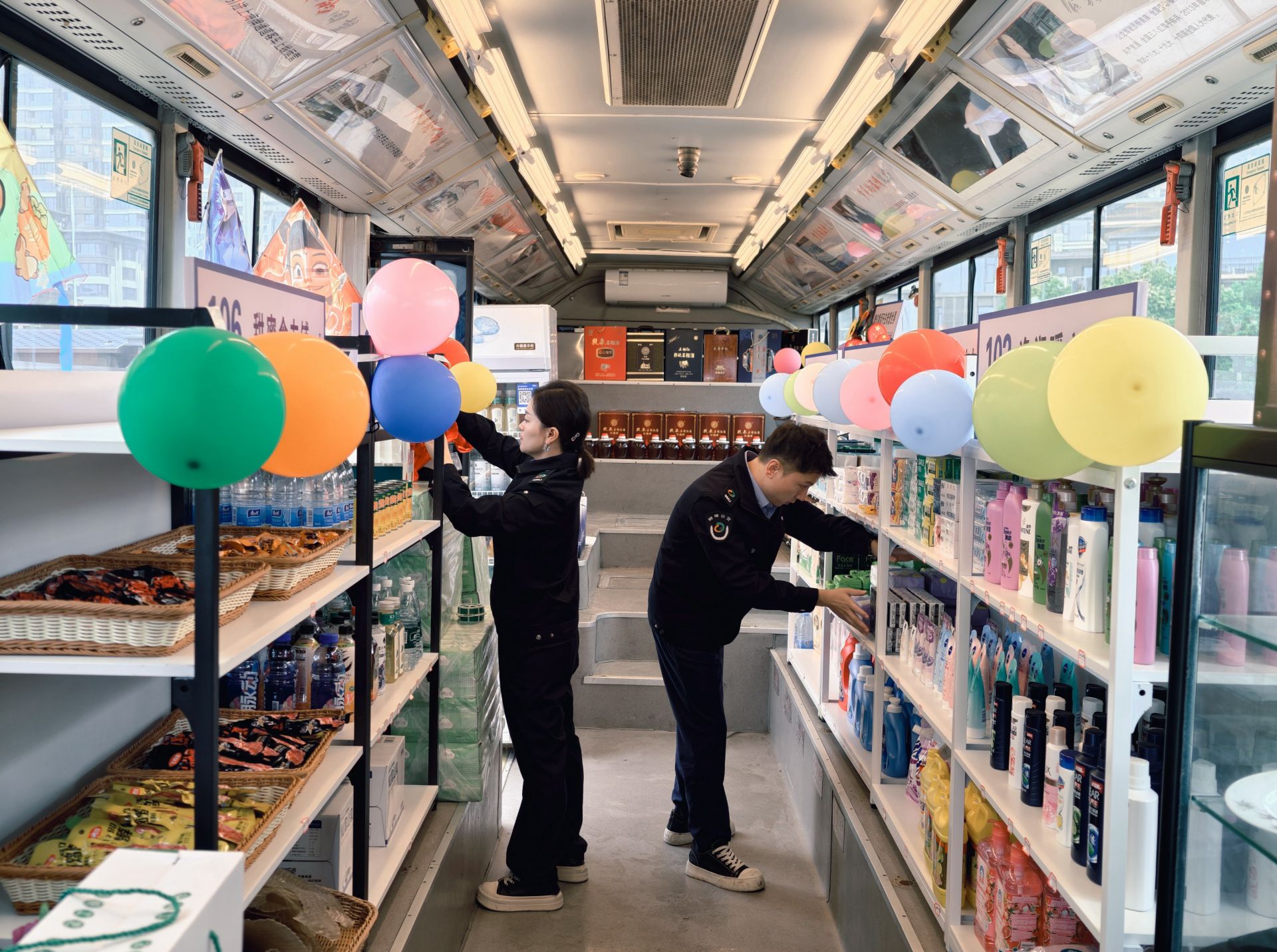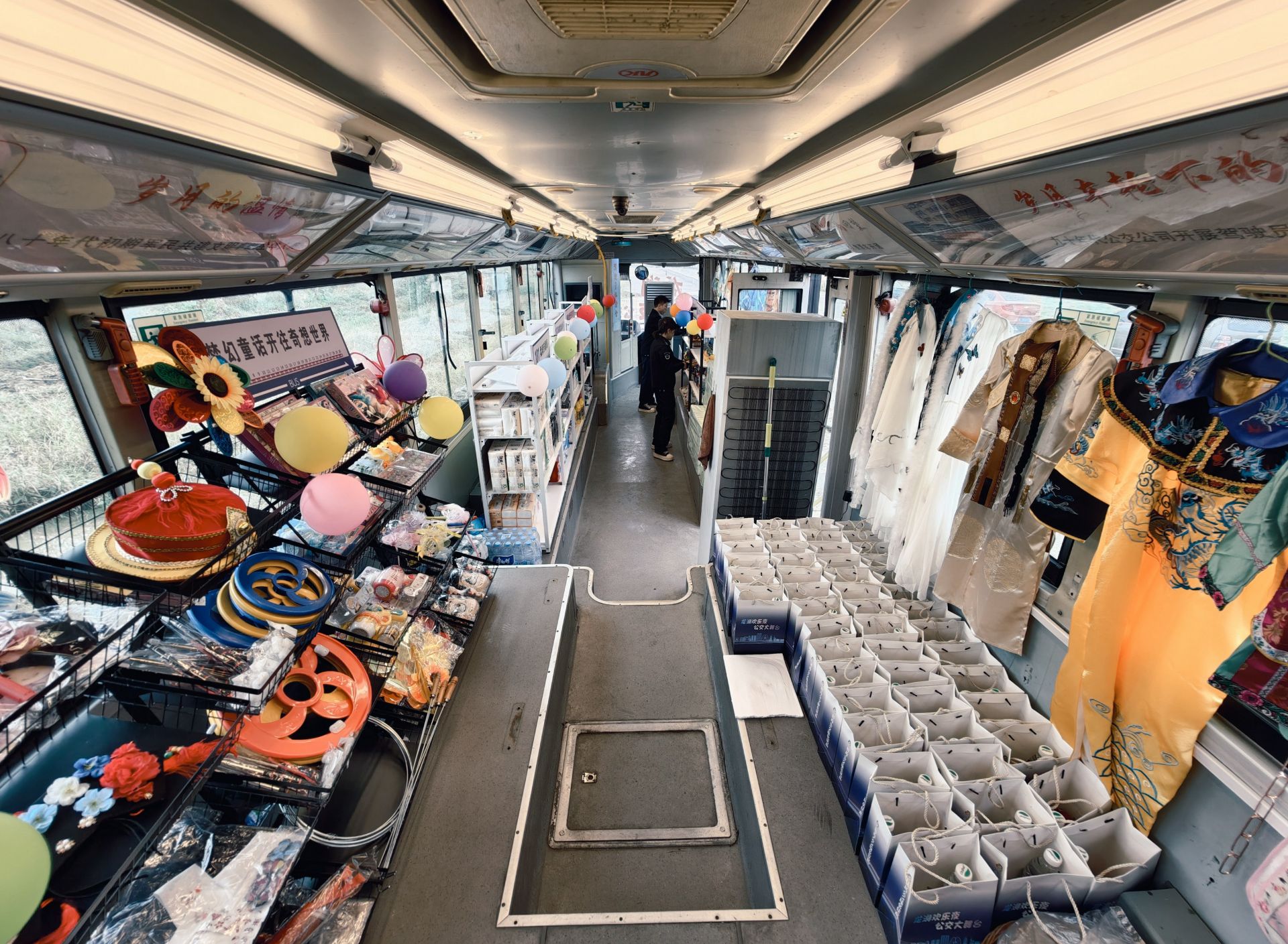 走进驿站,改造巧思随处可见。车身保留了经典的公交轮廓,车内则配备了空调与冰柜,营造出舒适的购物环境。货架上,从洗发水、沐浴露等日常用品,到本地土特产、饮料零食一应俱全,充分满足了不同的消费需求。此外,驿站还特别准备了多套古风、休闲风拍照服装,结合车身外绘制的“龙湖风景+公交元素”彩绘,使其迅速成为游客驻足留念的热门背景。