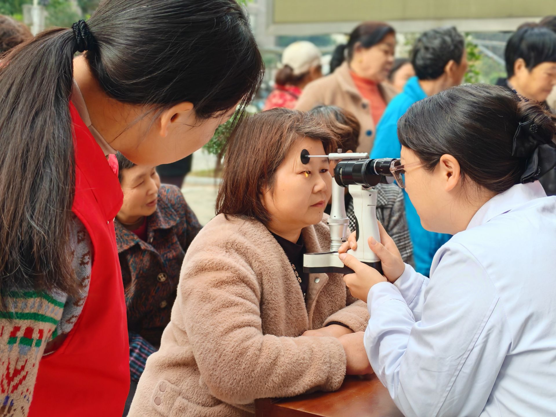 活动现场,小蚌埠卫生院组织内科、外科、眼科、口腔科等多科室骨干医护人员,为居民提供免费诊疗、健康咨询及基础检查服务。医护人员耐心为居民测量血压、血糖,检测眼底,通过听诊、问诊等方式初步判断健康状况,并针对高血压、糖尿病等常见慢性病给予个性化用药指导和饮食建议。
