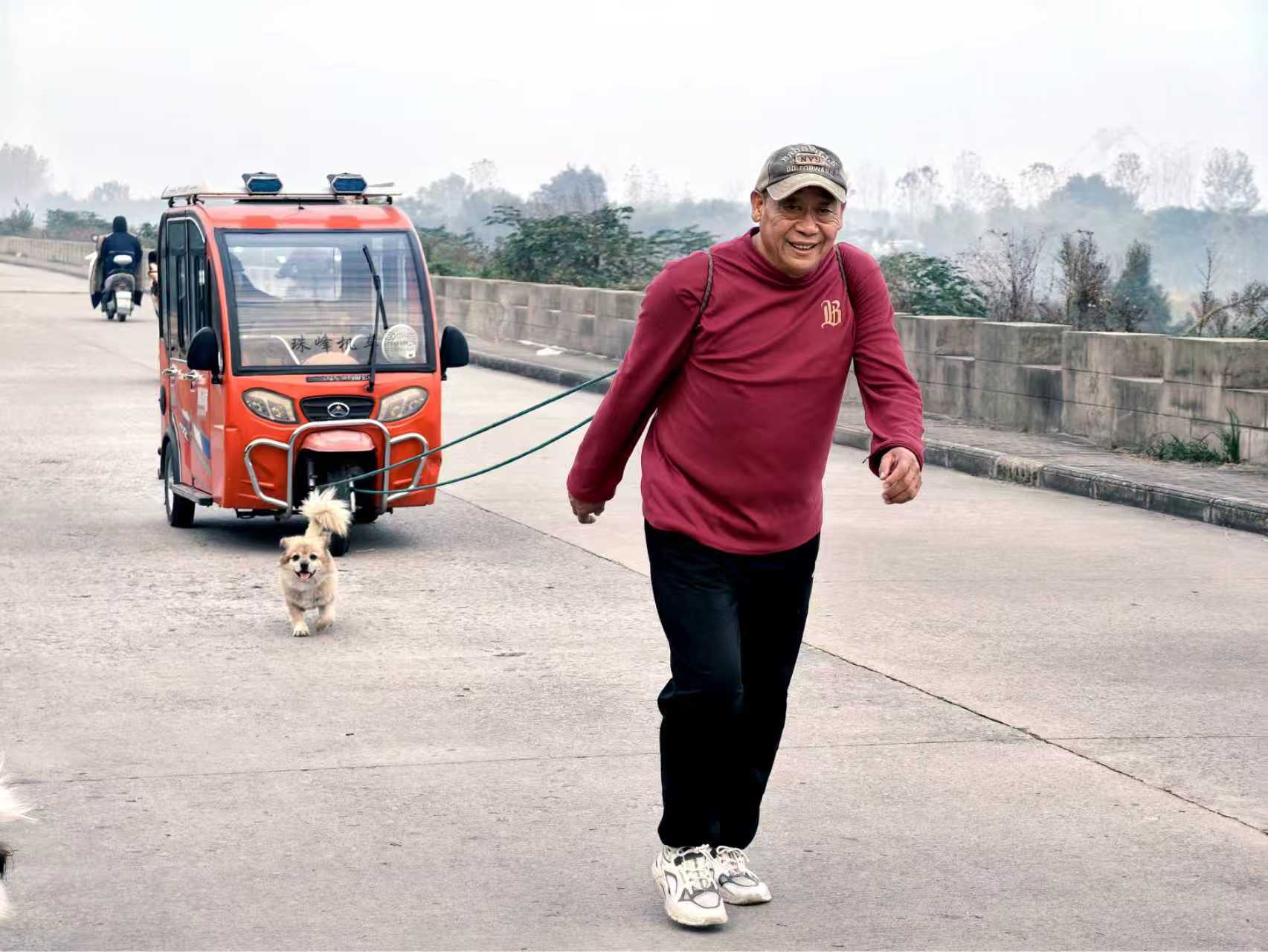 “老爷子虚岁100啦!1926年生,身子骨还算硬朗!”刘德才边调整肩头的绳结边笑着说道。四年前,他发现父亲年迈不愿在家喜欢坐三轮车出行,偶然间想到用绳子拉车,既能让老父亲出来放风、遛弯、散心,自己也能顺便锻炼,一举两得,便开启了每日两趟的“拉车晨练”。如今,他每天清晨六点至七点多、下午一点多到三四点准时出发,沿淮河堤坝往返三公里,只为老人舒心、自己尽兴。