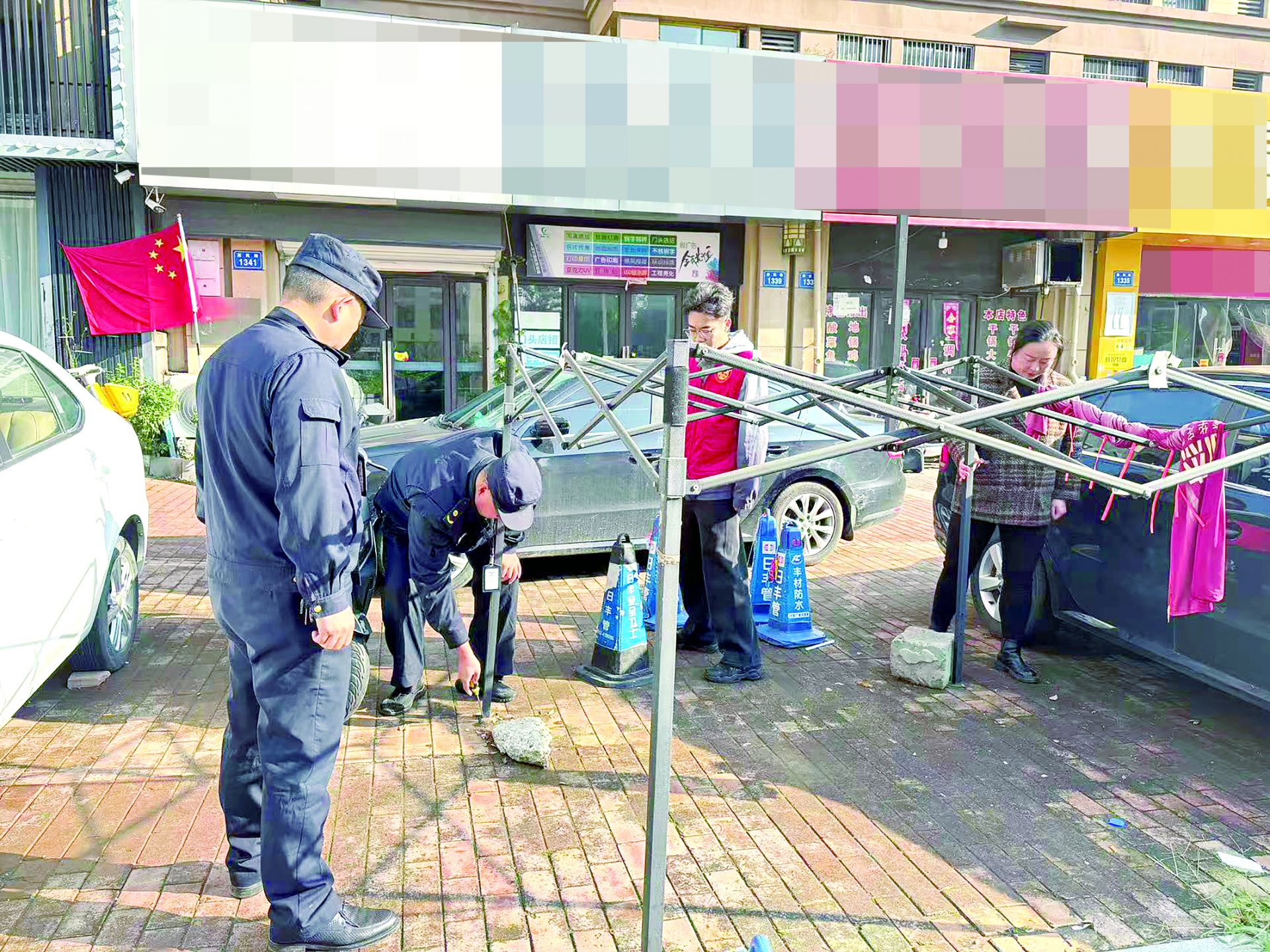 由于两侧的店面都是住宅楼“底商”,紧贴楼上居民,混乱嘈杂的环境和喧嚣不仅影响了路面环境,也对居民生活造成了一定影响。社区当然要上门做工作——新地城市广场社区书记俞静回忆起当时的情景:“我们多次上门与这些店主沟通,但效果甚微。对方往往只是口头答应‘好好好,知道了’,然后继续我行我素。”面对这一困境,社区想到了“城管进社区”机制。蚌山区城管局淮河中队中队长刘鹏接到社区求助后立即响应,带领队员深入了解现场情况,并部署力量开展治理。“我们多次上门劝导,并安排人员每天定点巡视、实时监督,逐步改善了这一区域的占道情况。”刘鹏介绍。