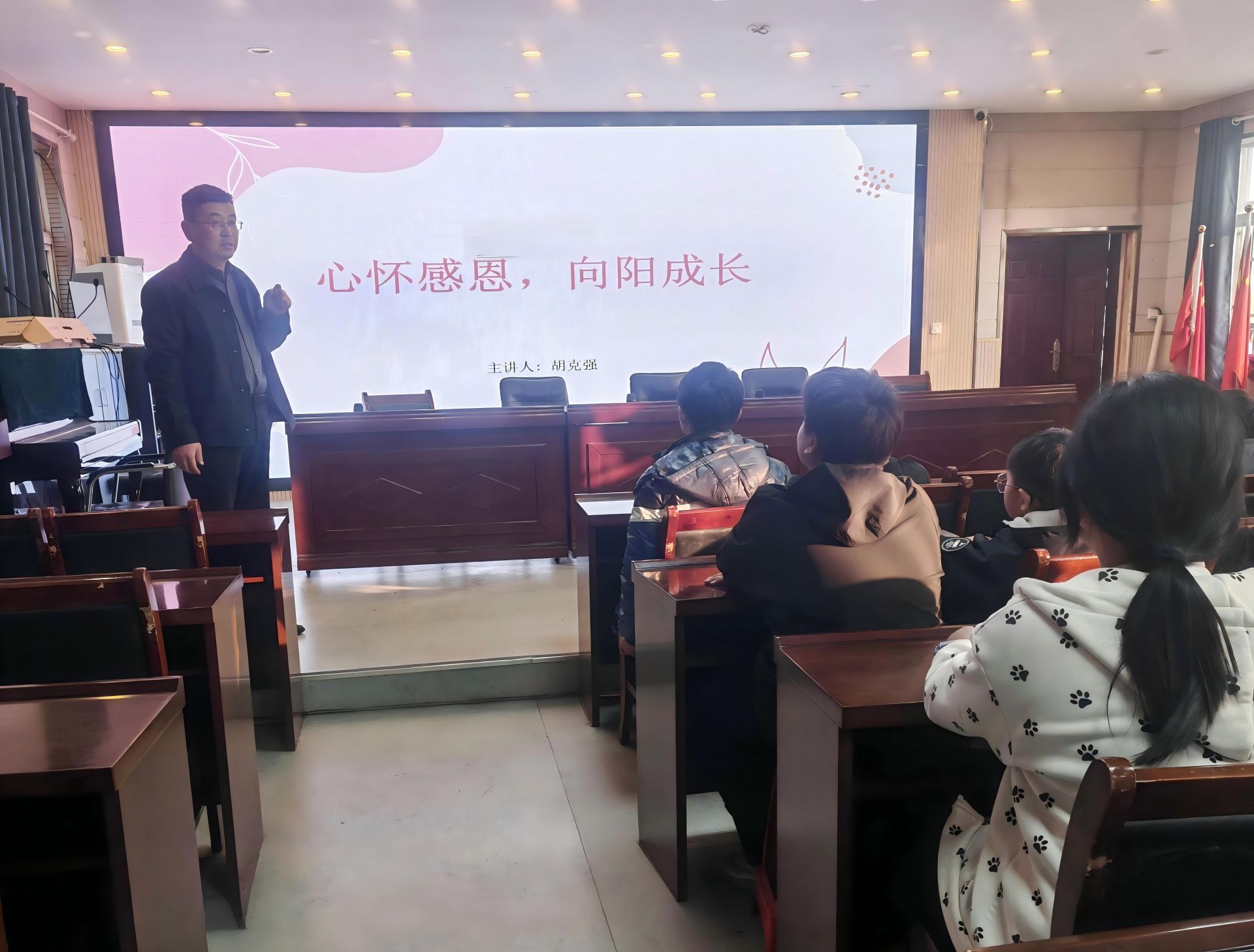 近日,怀远县龙亢镇实验小学多媒体教室内暖意融融,一场以“心怀感恩,向阳成长”为主题的道德讲堂活动在此举行。部分班级学生代表齐聚一堂,在校长胡克强的带领下,共同感悟感恩的力量,传承中华传统美德。