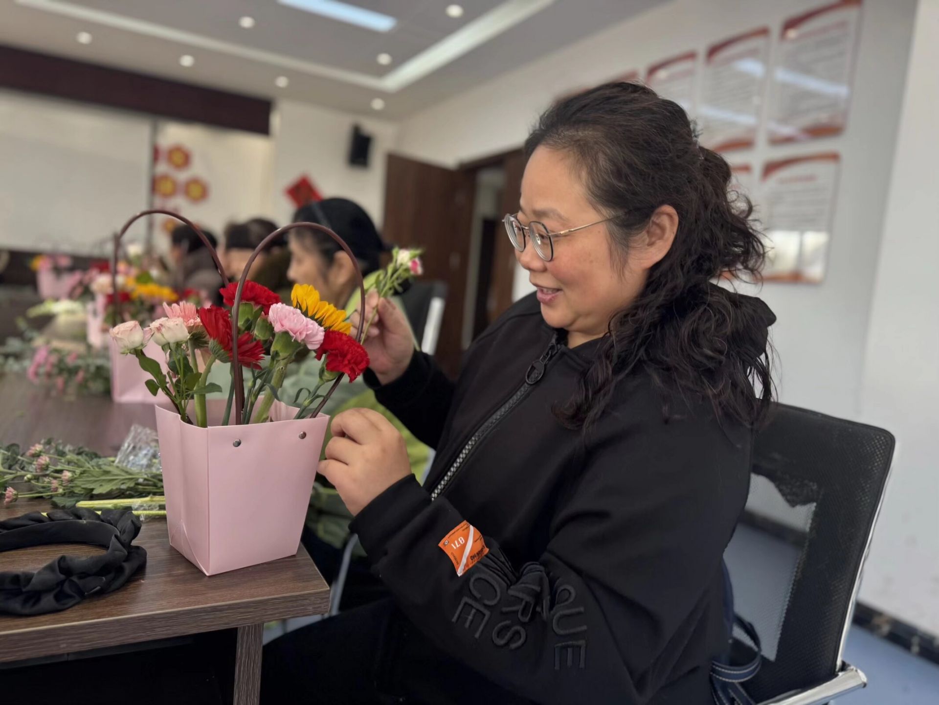 活动现场早早摆放好了玫瑰、康乃馨、洋桔梗、尤加利叶等十余种新鲜花材以及花泥、剪刀等工具,空气中弥漫着清新的花香。花艺志愿者用通俗易懂的语言,为大家讲解了插花艺术的起源与基本概念,随后结合现场花材,详细演示了插花的基本技巧——从如何根据高度确定花枝长短、不同花材的搭配原则,到色彩搭配的小窍门,甚至细致指导了花泥的浸泡方法与花枝插入的角度,一步步带领大家走进雅致的花艺世界。