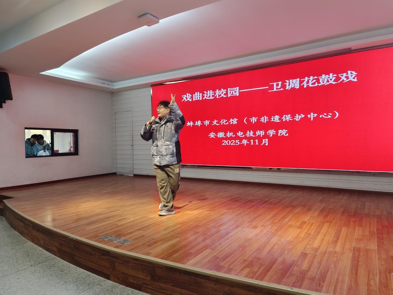 11月25日下午,蚌埠市文化馆(市非遗保护中心)走进安徽机电技师学院(安徽电子工程学校),开展非遗进校园活动。与传统的舞台表演不同,年轻的传承人向学生们展示了非物质文化遗产项目——卫调花鼓戏,它以婉转的唱腔、灵动的身段和浓郁的地方特色,被列入安徽省非物质文化遗产名录。