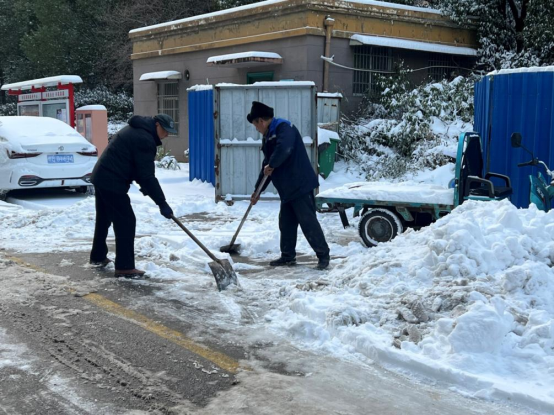 面对积雪和低温带来的安全隐患,社区书记清晨立即启动应急响应,通过工作群组快速部署,明确责任分工和清扫重点。工作人员不畏严寒,携带铁锹、雪铲、扫帚等工具,迅速投入到扫雪工作中。大家齐心协力,配合默契,忙碌的身影在皑皑白雪中形成了一道亮丽的风景线,以实际行动践行服务初心。