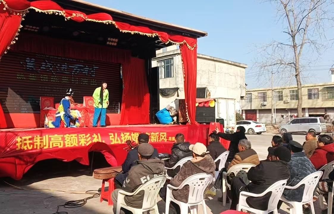 冬日暖阳照耀下,演员们个个精神饱满,唱腔悠扬,深深吸引了台下的观众。村民们听得入神,掌声、喝彩声此起彼伏。据介绍,陈集镇“送戏下乡”系列活动在节目编排上注重融合地方特色与时代主题,既保留传统戏曲韵味,又凸显移风易俗导向,让群众在欣赏表演中潜移默化接受教育。演出间隙,工作人员还向村民发放宣传资料,现场讲解文明婚嫁政策,引导村民树立“爱情无价 彩礼有度”的婚恋观念,践行简约适度的礼仪新风。