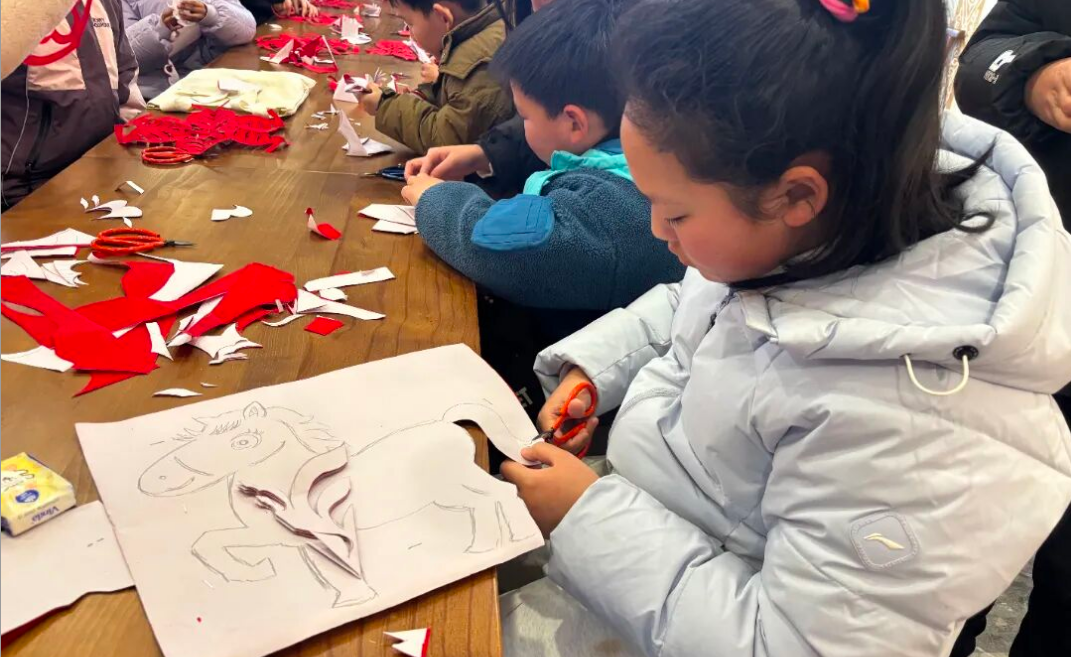活动现场,非遗传承人详细讲解剪纸历史文化与基本技法,示范折纸、裁剪等关键步骤,手把手指导创作。孩子们手持剪刀、沿稿裁剪,灵动小马、吉祥福字、生肖纹样等作品逐一呈现,剪刀起落间尽显童真童趣,寄托着对新春的美好祝福。