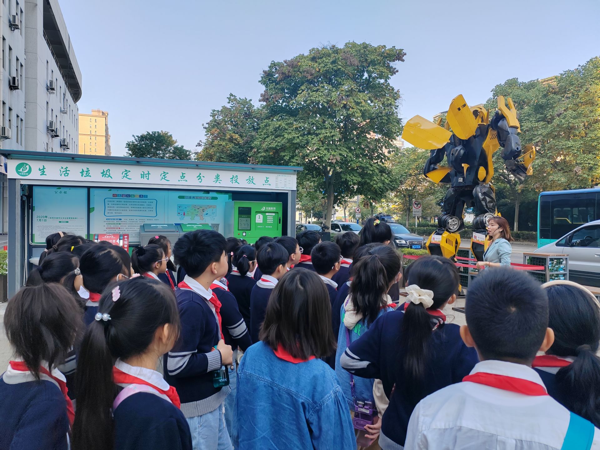 学生们排着整齐的队伍走进蚌埠市生活垃圾分类宣教中心,用回收的旧铁制作的“大黄蜂”机器人瞬间吸引了学生的注意力,让学生感受到变废为宝的魅力!活动现场,讲解员向学生们详细讲解了垃圾降解周期、垃圾的危害、生活垃圾减量化等知识,并通过实物创意展示、互动游戏等丰富多彩的方式,让学生进一步了解垃圾分类的处理流程及方法,学会正确进行垃圾分类。