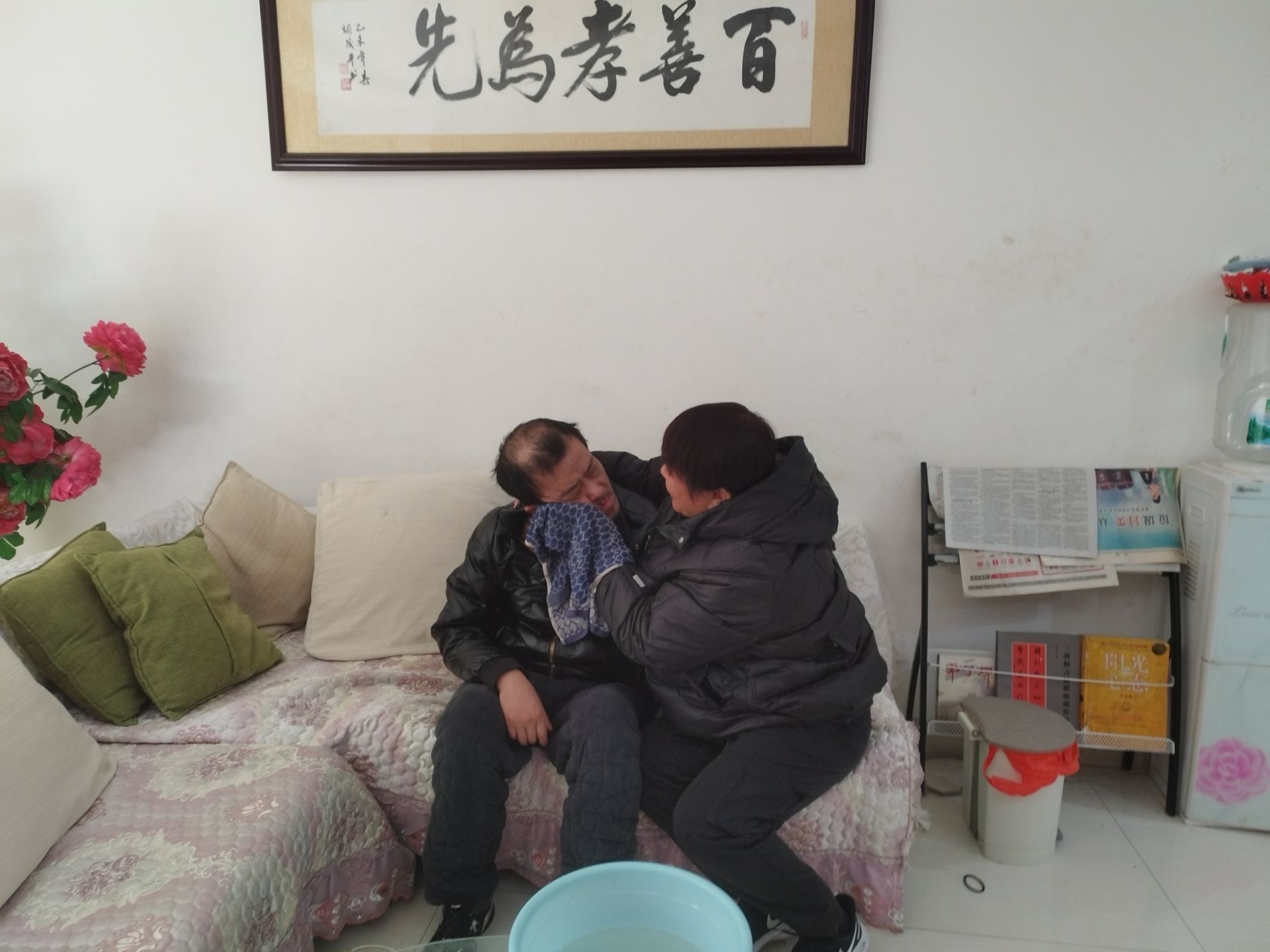 走进宫金妹的家,房子不大,但温馨整洁。客厅里挂着一幅“百善孝为先”的书法作品,窗户旁的红色花朵向阳开着。