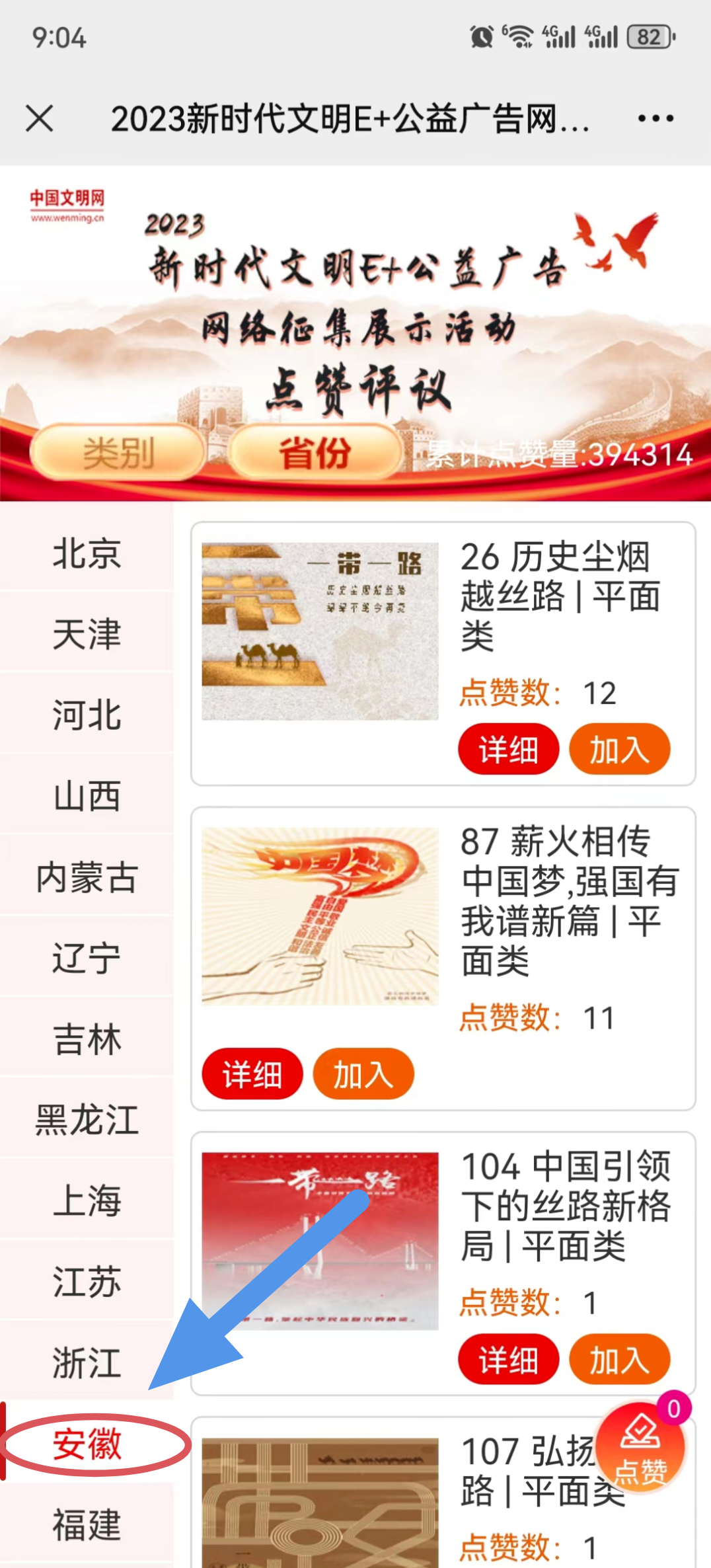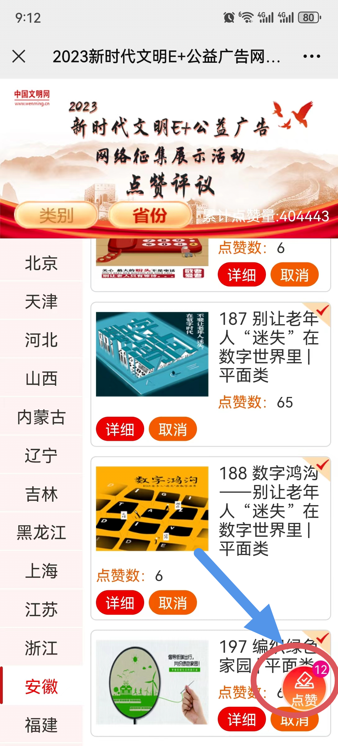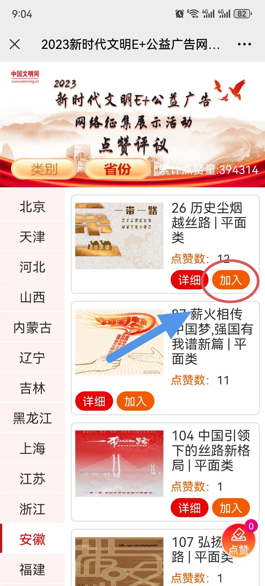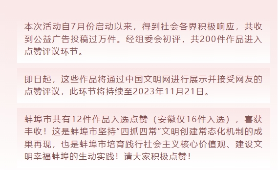 家人们 快来为蚌埠市加油助力! 由中央精神文明建设办公室主办的 “新时代文明E+公益广告网络征集展示活动” 开始点赞啦! 蚌埠市12件入围作品 ↓↓↓ 点赞方式 1、微信扫描下方二维码进入投票页面 2、点击省份,选中安徽 3、点击“加入”,选中的12件作品加入“点赞”悬浮窗 4、进入投票页面,点击“点赞评议”进行投票 5、投票成功 活动期间 每位网友对每件作品只能点赞一次 点赞评议将持续至11月21日