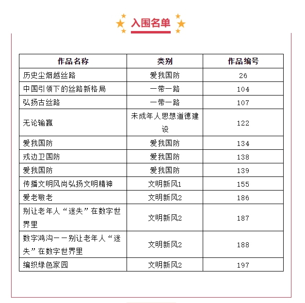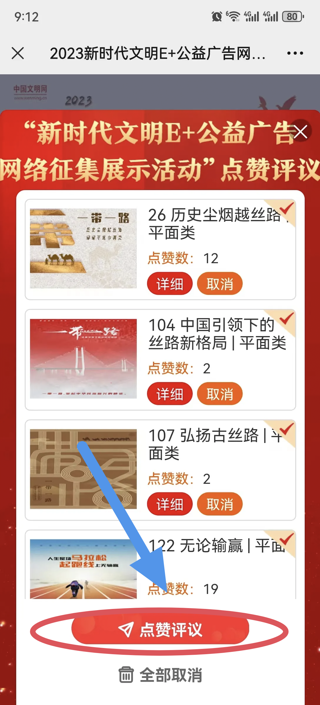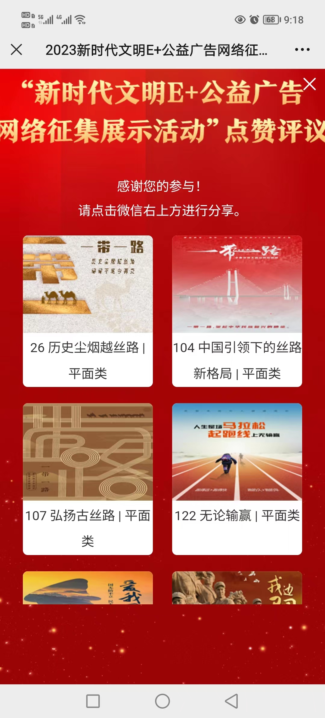 家人们 快来为蚌埠市加油助力! 由中央精神文明建设办公室主办的 “新时代文明E+公益广告网络征集展示活动” 开始点赞啦! 蚌埠市12件入围作品 ↓↓↓ 点赞方式 1、微信扫描下方二维码进入投票页面 2、点击省份,选中安徽 3、点击“加入”,选中的12件作品加入“点赞”悬浮窗 4、进入投票页面,点击“点赞评议”进行投票 5、投票成功 活动期间 每位网友对每件作品只能点赞一次 点赞评议将持续至11月21日