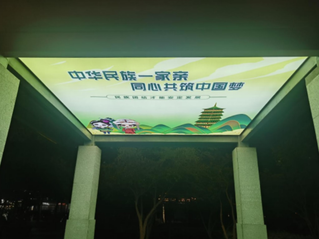 近日,明珠社区为明珠广场六个凉亭顶部灯光进行创新升级并投入使用。顶灯以民族团结为主题,通过LED灯+软膜的形式,使凉亭夜间更加鲜明、醒目,同时勾勒出民族风姿,“点亮”城市文明,助力文明城市创建。 融媒体记者 阎然 通讯员 陈雪姣 摄