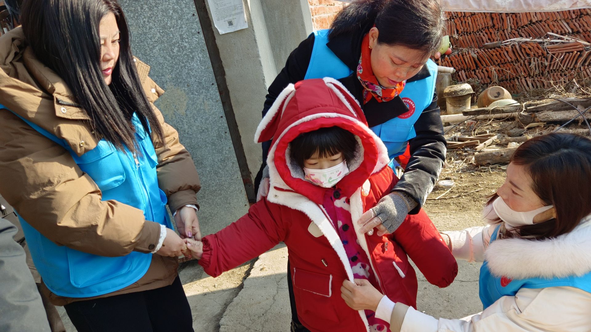 12月24日上午,固镇县任桥志愿者服务队的志愿者们不畏严寒,驱车来到泰山村新庄,给孩子带来了棉衣、棉鞋、米、面、油等生活用品,志愿者们来到小女孩家中,当看到孩子穿着单薄衣服,小手冻得通红,连忙拿出准备好的棉衣为她穿上,帮她暖手,在场的志愿者看到这一幕,纷纷潸然泪下,孩子爷爷对我们的到来十分感动,激动的说到:“感谢这么多好心人对我孙女的关心关爱,孩子这么小就得了白血病,太可怜了,多亏了现在国家好政策,党和人民政府的关怀和社会上这么多好心人的帮助,让这个冬天变得温暖”
