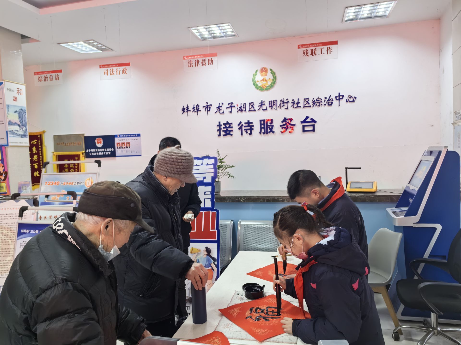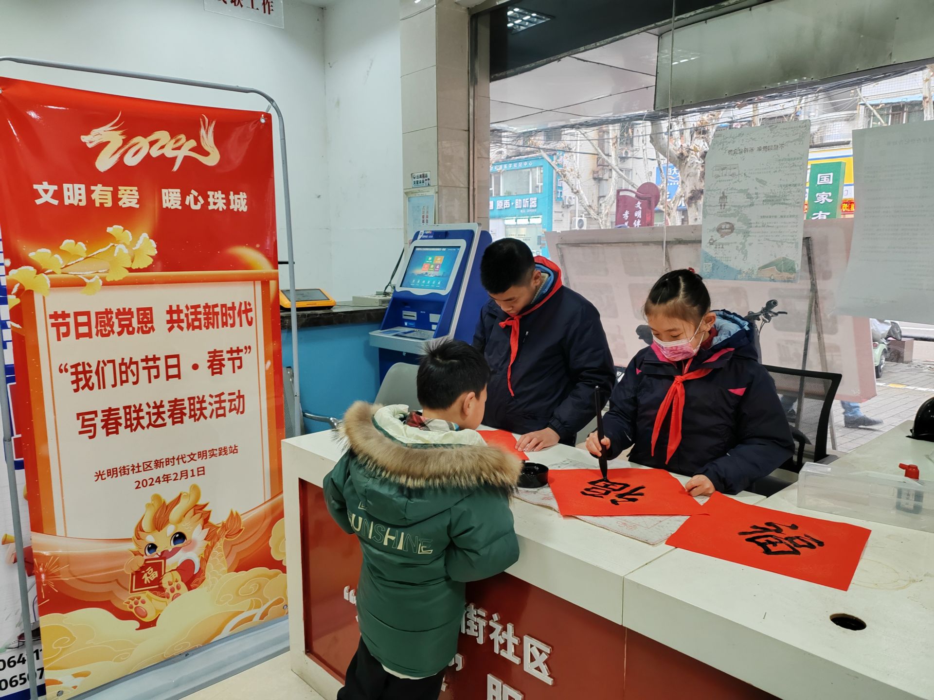 为弘扬和传承中国传统文化,增强爱国主义教育,丰富学生的寒假文化生活,营造喜庆祥和的节日氛围,在春节来临之际,2024年2月1日凤阳路第一小学组织少先队员和党员志愿者到光明街社区携手开展了“小手写春联 童心送祝福”——“我们的节日•精神的家园 春节” 迎新年实践活动。
