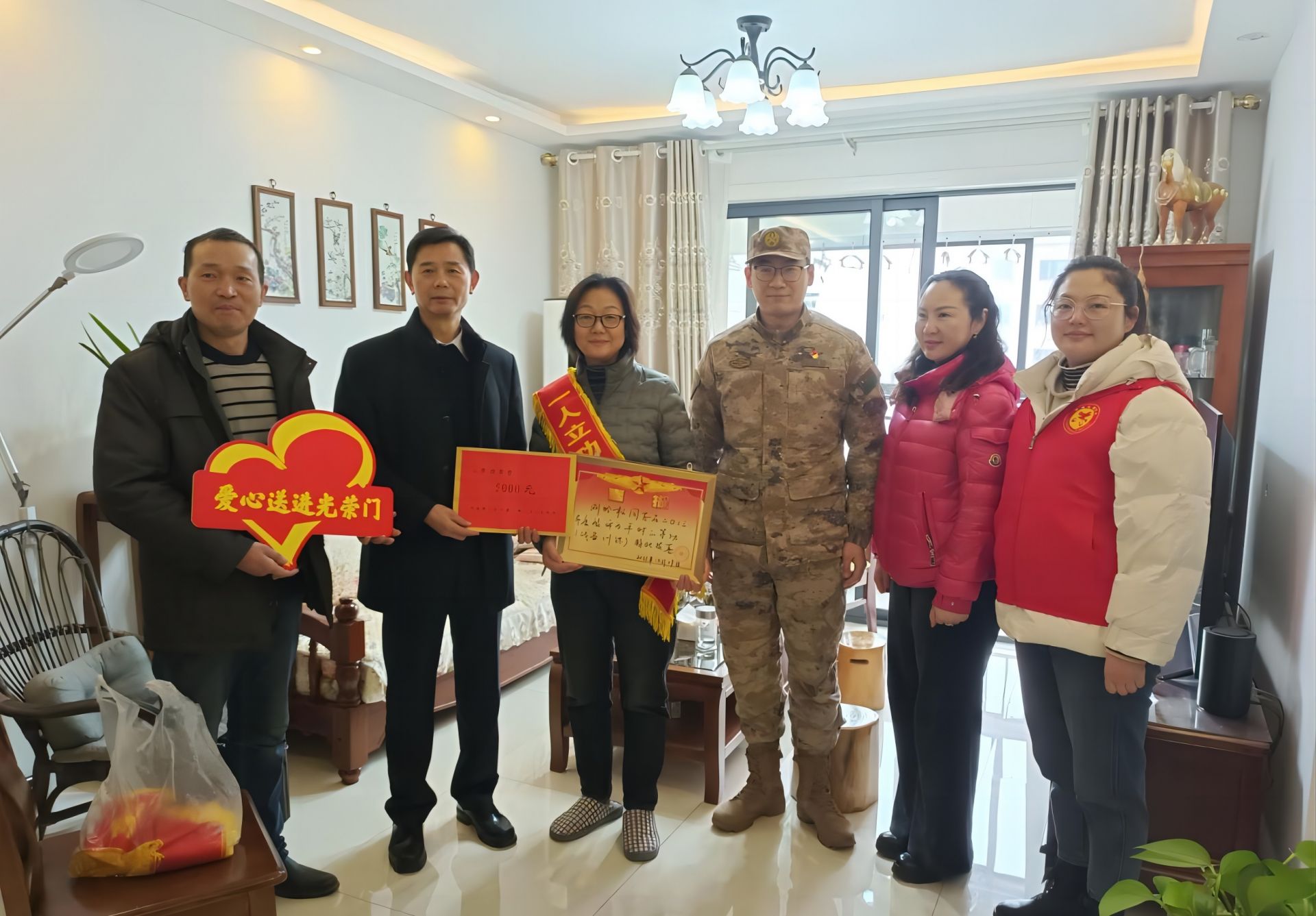 近日,蚌山区退役军人事务局、区人武部、菱湖社区新时代文明实践站为荣立三等功的现役军人刘吟松家属送去立功喜报和慰问金,送达党和政府的关心及新春祝福。 杨丽艳 摄