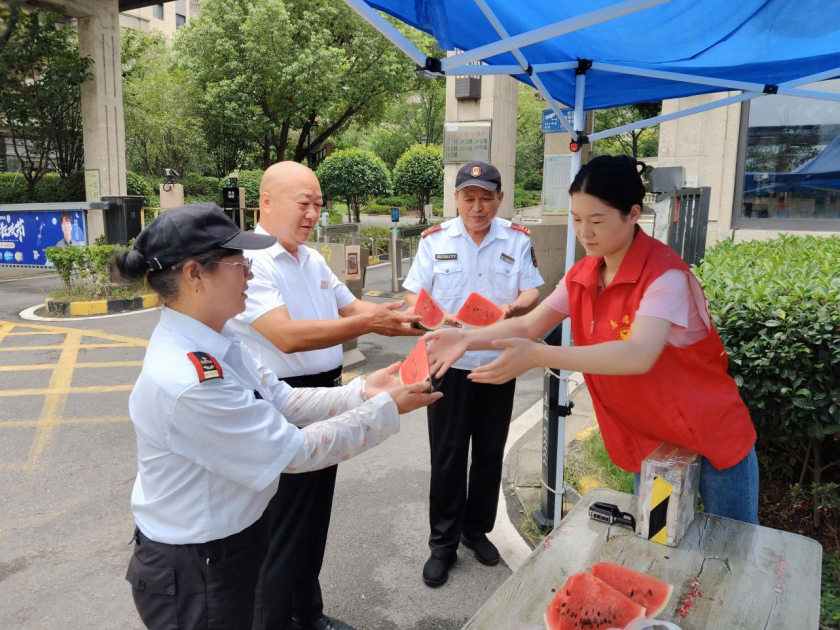 近日高温,蚌山区湖滨社区中心天御华府社区工作人员为坚守岗位的门岗师傅们送上新鲜西瓜,感谢他们不畏酷暑守护小区安全。师傅们接过西瓜,脸上露出开心的笑容。(张艳)