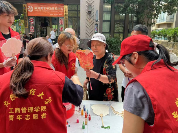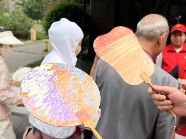 安徽财经大学的大学生志愿者们,作为社区共建共治的年轻力量,满怀热情地当起了“非遗小老师”。他们不仅提前准备好了漆扇制作的全部材料,更通过扎实的前期功课,用通俗易懂的语言,为居民们讲解了漆扇背后的历史文化、艺术特色和制作方法。在志愿者们手把手的耐心指导下,来自社区各方的参与者都兴致勃勃地尝试构图、调漆、晕染等步骤。大家相互交流学习,在其乐融融的氛围中,加深了居民间的了解,增进了邻里情。